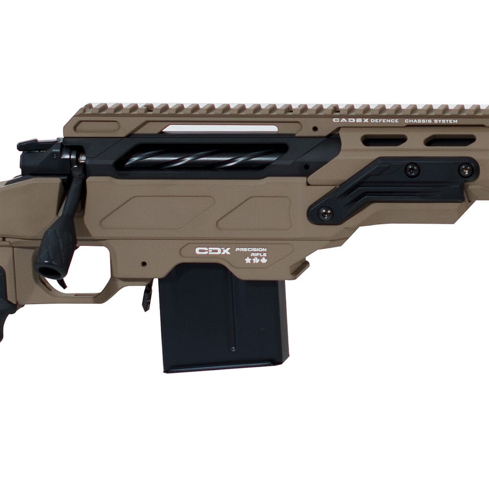 The Cadex CDX-Tac rifle is a straight forward no-nonsense sniper rifle designed to meet the needs of both operators and precision competition shooters. Depending on the caliber, the CDX-Tac features one of Cadex’s the custom actions: the CDX-30 Guardian Action (short action calibers), the CDX-300 Freedom Action (.300 Win. Magnum), or the CDX-33 Patriot (.300 Norma Magnum, .338 Norma Magnum, or .338 Lapua Magnum). All three action types are CNC/wire EDM machined from 416 Stainless Steel and are cerakoted. The bolt utilizes 3 lugs, allows for a 60° bolt throw, and is fluted for weight reduction. Each CDX-Tac rifle is outfitted with a Bartlein straight taper match grade barrel that has been fluted for weight reduction and increased barrel cool down. Additionally the barrel of Cadex’s CDX-Tac is 5R Single Pointed rifled for unparalleled accuracy. The rifle features Cadex’s own DX2 Evo Two Stage trigger than can be easily converted to a one stage trigger based on the shooters preference. The CDX-Tac offers the same level of reliability and accuracy as the CDX-Lite rifle, but is more lightweight and cost effective.
