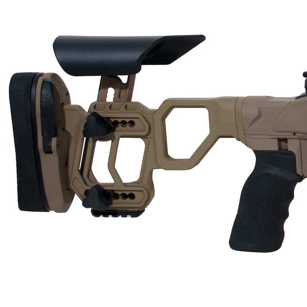 The primary differences between the CDX-Tac and the CDX-Lite lies in the chassis design. The CDX-Tac uses Cadex’s Field Tactical Chassis that features a fixed skeletonized buttstock. The Field Tactical Chassis is machined from 6061-T6 aluminum billets, anodized, and then finished with a non-reflective paint. The buttstock of the CDX-Lite, despite being skeletonized allows for tool-less adjustments to the length of pull, cheek piece, and recoil pad height. The underside of the buttstock features a monopod rail for increased stability in non-ideal shooting scenarios. The chassis also features an over-the-action optics rail that is set to either 20 MOA (short action) or 30 MOA (long action). The oversized trigger guard ensures that the shooter can confidently manipulate the trigger while wearing gloves. The forend of the rifle is outfitted with M-Lok attachment points and pre-installed picatinny rails at the 3, 6, and 9 o’clock positons for the mounting of bipod and other mission critical accessories.