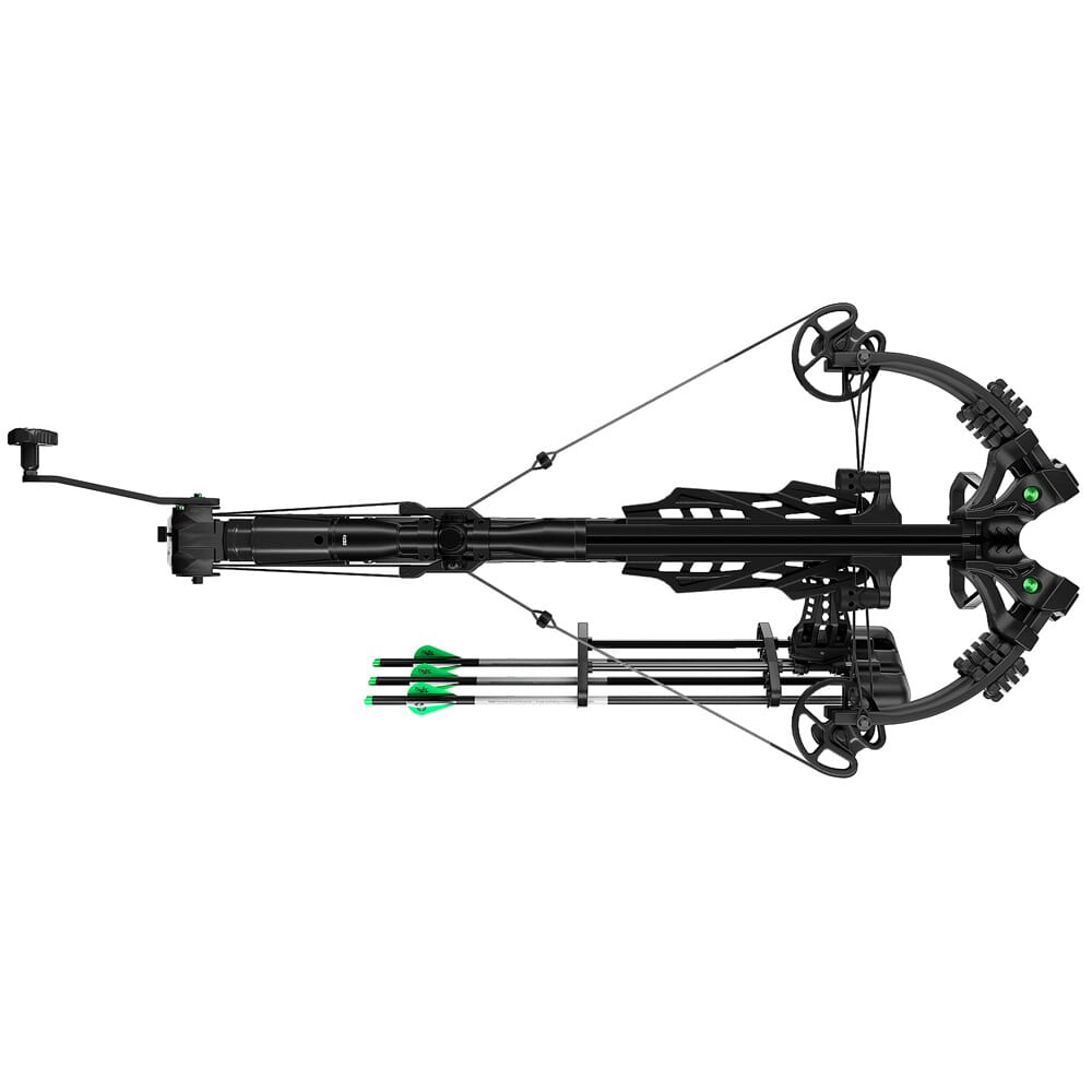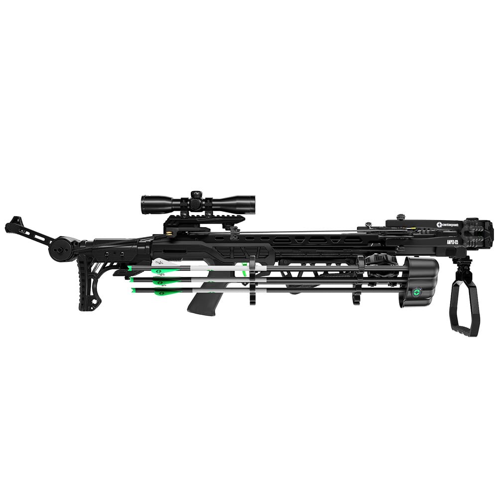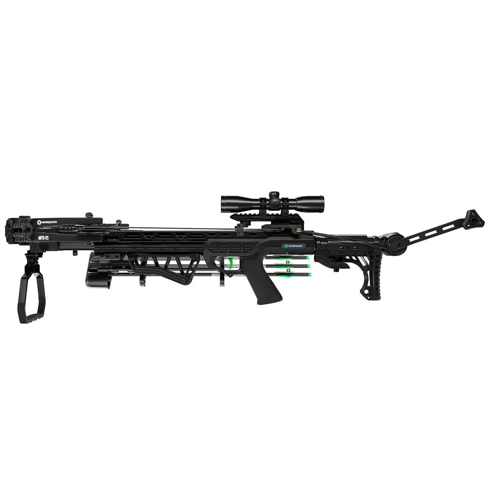 CenterPoint’s Amped 425 delivers high power and next level features! When fully cocked, the axel-to-axel width is a mere 12 inches, and sends bolts down range at a ripping 425 fps. The stock features a configuration similar to that of an AR15, and its length of pull and cheek height can be finely adjusted to fit the user’s preference. The Amped 425 is also equipped with a series of limb dampeners and string silencers to keep noise and vibrations to a minimum. Other features of the Amped 425 include an anti-dry fire system, auto-safety trigger mechanism, and a CNC-machined aluminum rail and cam system. In addition, the Amped 425 ships with an illuminated 4x32mm scope, three 20-inch bolts, a parallel quiver, and a rope cocker.