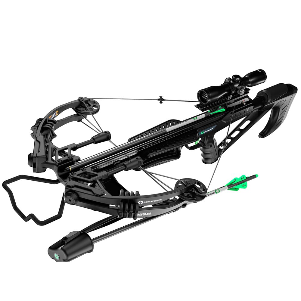 CenterPoint’s Dagger 405 combines high performance and ergonomics! When fully cocked, the axel-to-axel width is a mere 14.5 inches, and sends bolts down range at a ripping 405 fps. The stock features a configuration similar to that of an AR15, and its length of pull and cheek height can be finely adjusted to fit the user’s preference. To keep noise and vibrations to a minimum, the Dagger 405 is equipped with CenterPoint’s own Whisper Silencing System which utilizes a series of string stops, limb dampeners, and string silencers. Other features of the Dagger 405 include an anti-dry fire system, auto-safety trigger mechanism, and a CNC-machined aluminum rail and cam system. In addition, the Dagger 405 ships with an illuminated 4x32mm scope, three 20-inch bolts, a parallel quiver, and a rope cocker.