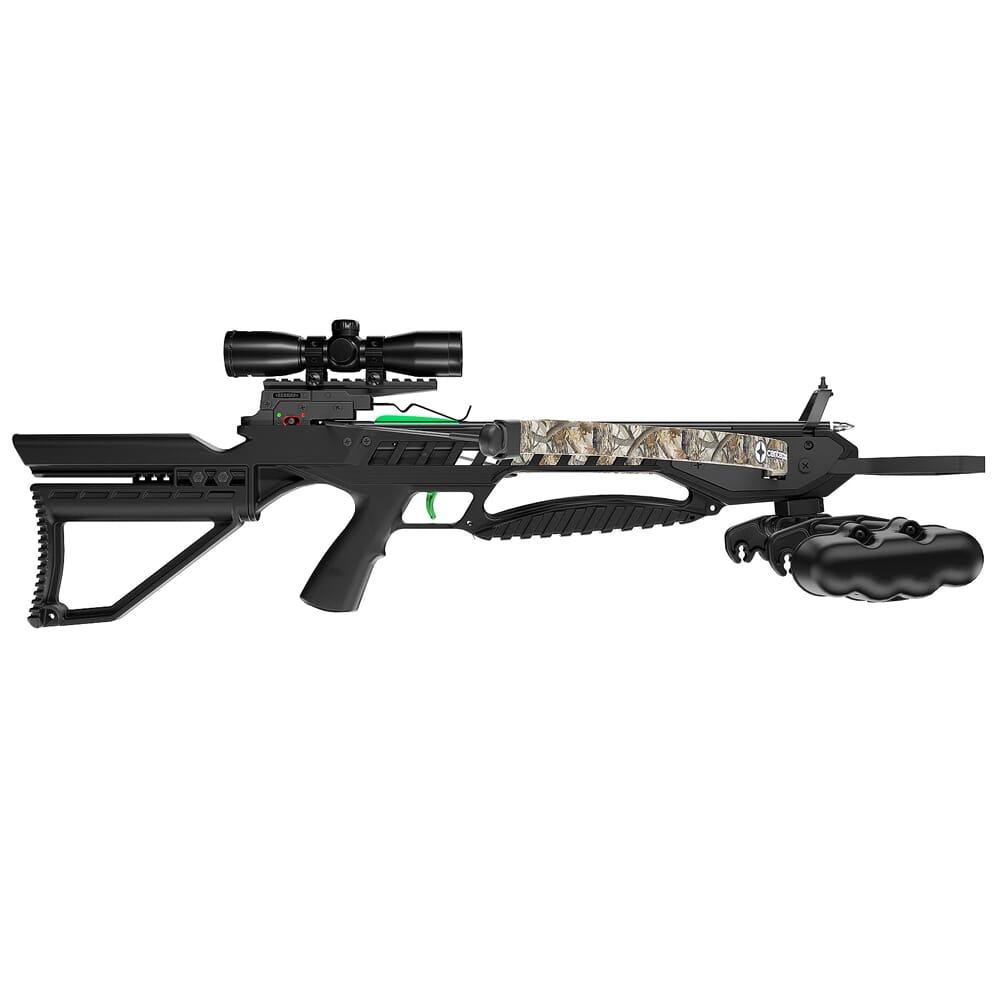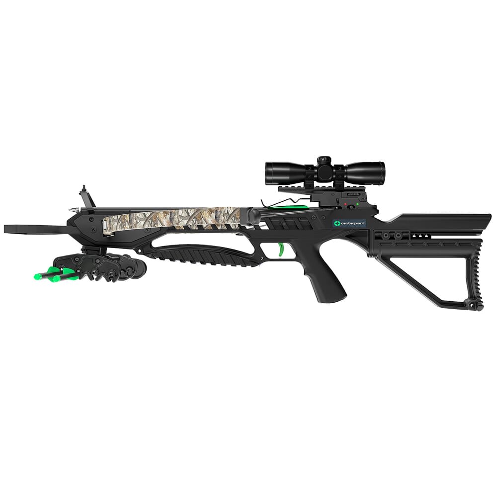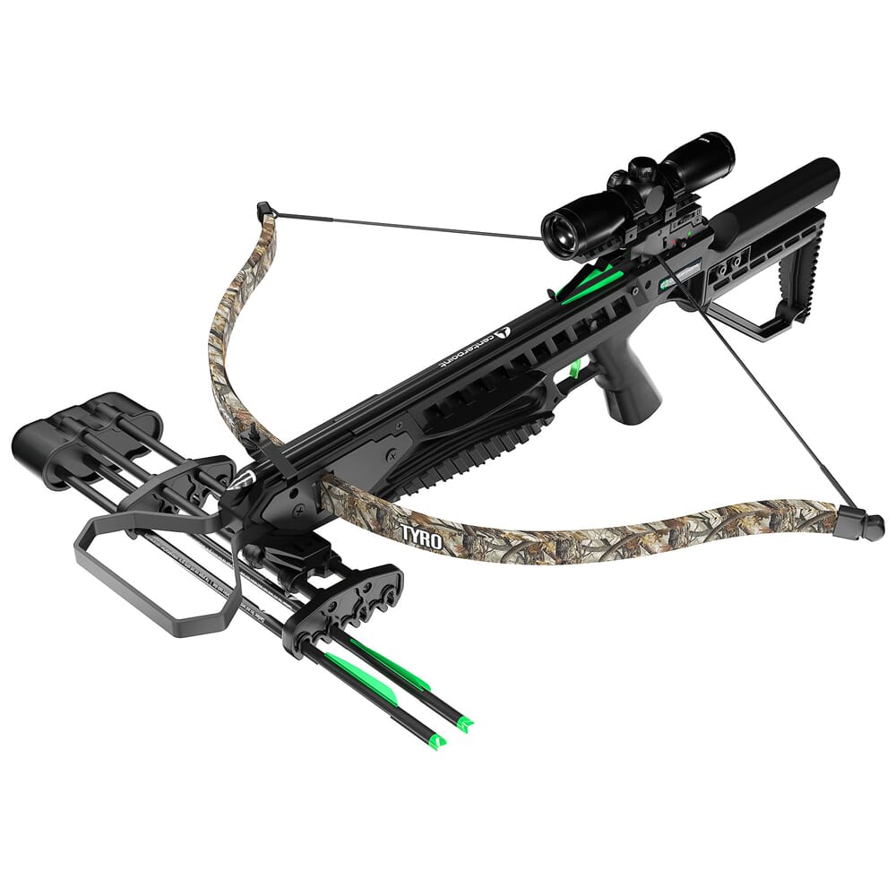 The Tyro Crossbow by CenterPoint features a traditional recurve configuration and is ready to go right out of the box. The Tyro is capable of sending bolts downrange at 245 feet per second – more powerful that recurves of the same class, but still lighter than most compound bows. It’s simple operation is perfect for new shooters, and helps reinforce proper shooting mechanics, such as aim, trigger pull and follow through. In addition, the Tyro comes with a full accessory package that contains: (1) 4x32mm scope, (3) 16-inch 420 bolts, (1) detachable quiver, and (1) rope cocker.