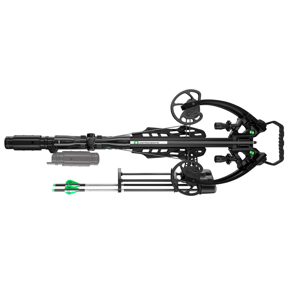 CenterPoint’s Wrath 430X delivers high speed in a compact package. It features a unique reverse-draw, bullpup design, giving the crossbow an overall length of just 28.26” and a width of 9”. Despite its short and slim profile, the Wrath is able to send bolts downrange at an astounding 430 feet per second with a devastating 164 foot pounds of energy on impact. Other features of the Wrath 430X includes durable CNC-machined aluminum rails, and a ball-bearing retention spring to keep the arrow in place. In addition, the Wrath 430X comes with a full accessory package which contains: (1) 4x32 illuminated scope, (3) 20” bolts, (1) parallel quiver, and (1) silent cranking device.