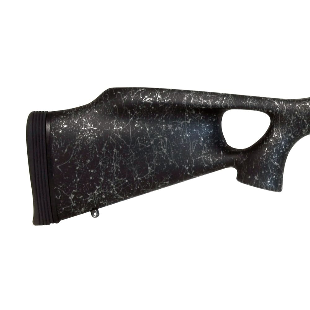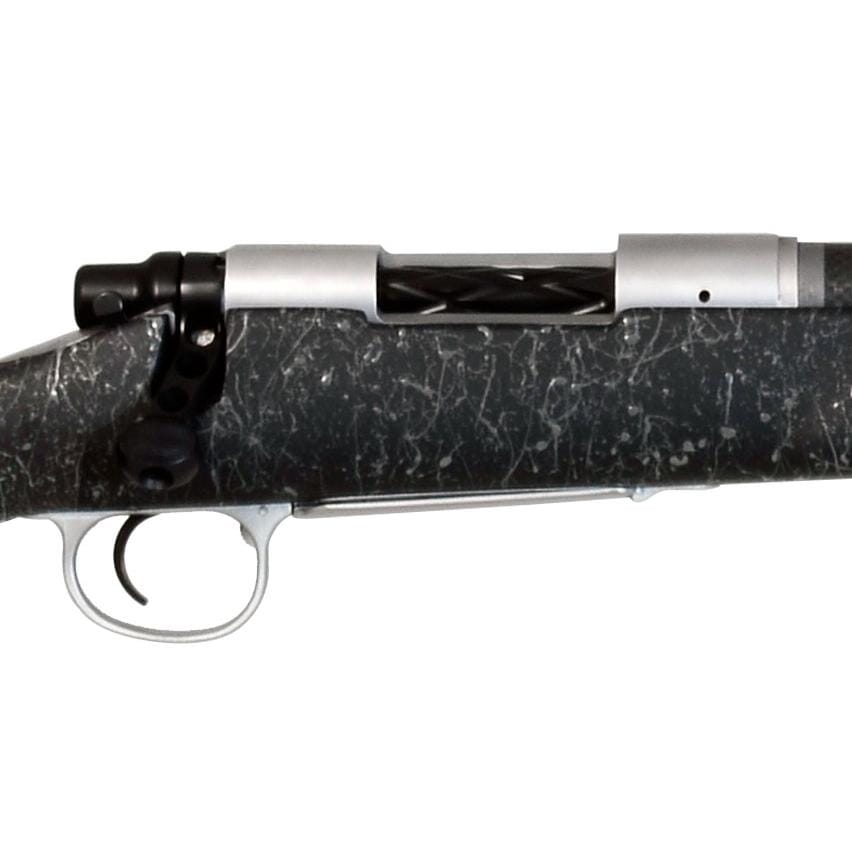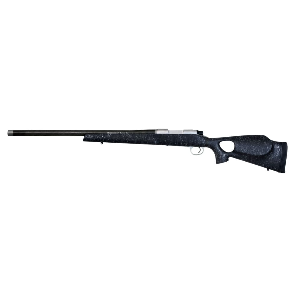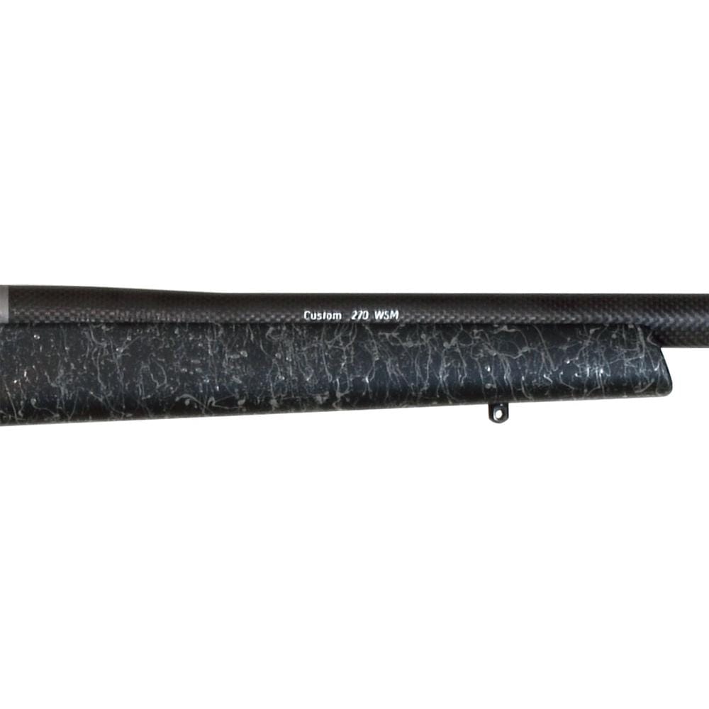 This custom built Christensen Arms Carbon One .270 WSM rifle includes a 24" barrel, stainless steel action, Timney trigger, brake, and a black thumbhole stock with gray webbing.