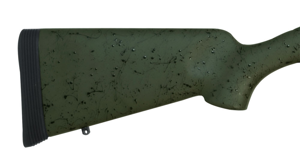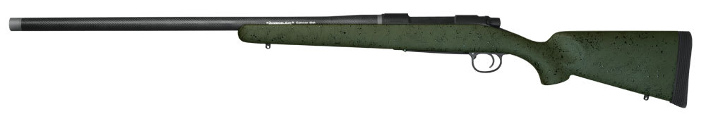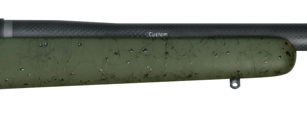 This custom built Christensen Arms Carbon One .300 Rem Ultra Mag rifle includes a stainless steel action, 26" barrel, Timney trigger, titanium muzzle brake, and a classic green stock with black webbing.