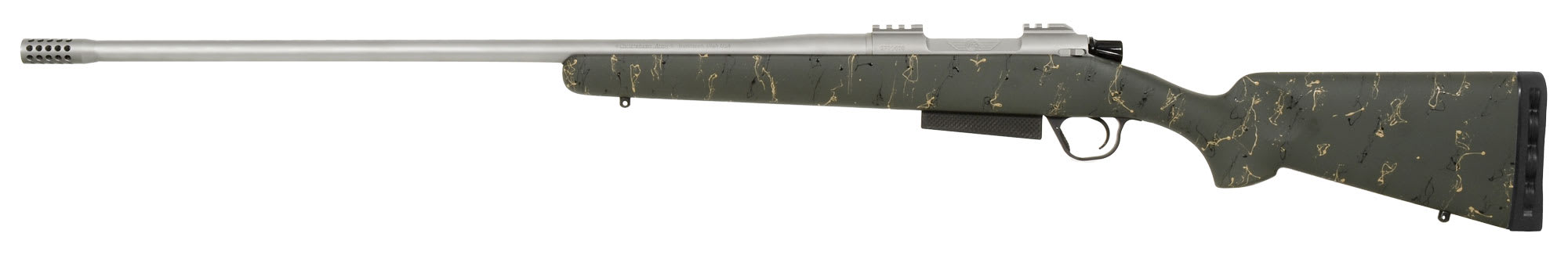 This Christensen Arms Classic XL Mag .338 Lapya rifle features a 26" long range barrel, 20 MOA Split Rail, Aerospace DNA, titanium muzzle brake, spiral fluted nitride coated bolt, recoil pad, Timney trigger, drop-box magazine, tier 2 green stock with tan webbing, and a guaranteed 1 MOA accuracy.