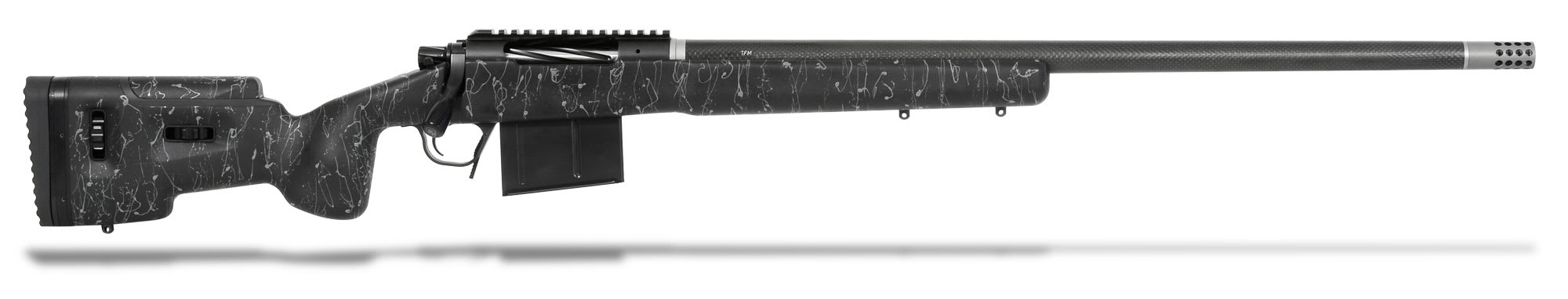 This Christensen Arms TFM Carbon 300 Win Mag rifle features a black hand-laid, glass bedded Tier 1 carbon stock with gray webbing, adjustable Timney trigger, tactical bolt knob, 1/2 MOA accuracy guarantee, carbon-fiber wrapped select match grade 26" barrel, mini M16 style extractor, integral picatinny rail, spiral flute bolt, and a removable drop magazine box. Includes titanium muzzle brake.