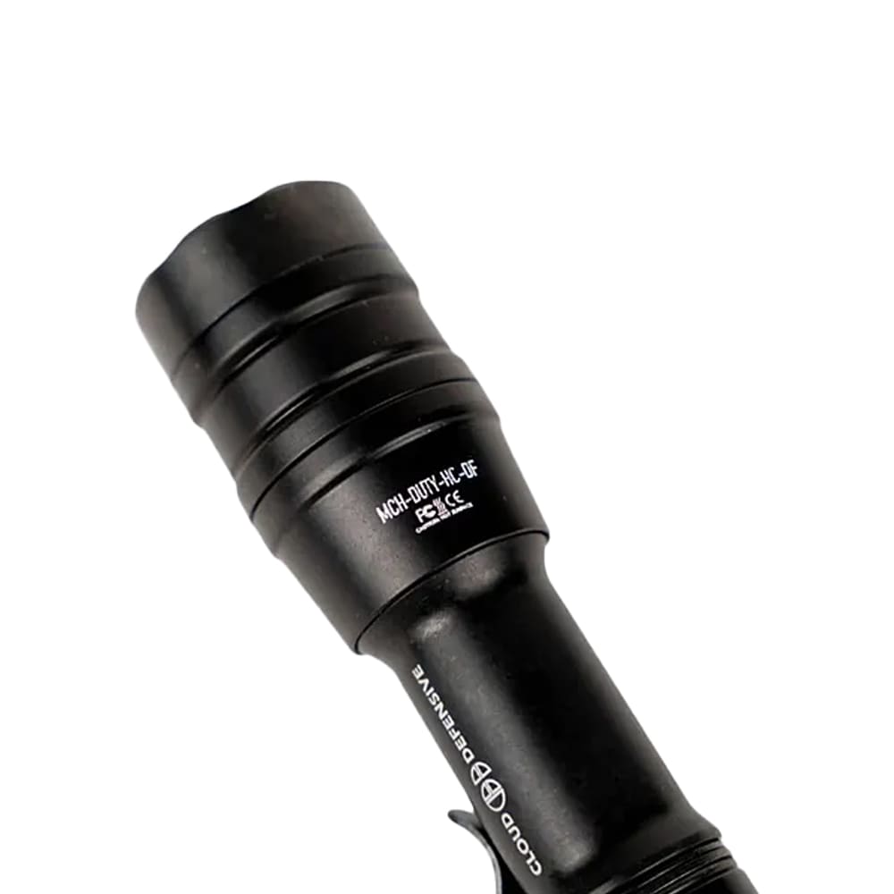 The Cloud Defensive MCH High Candela Duty Light is a full-size tactical flashlight designed for law enforcement, military, and personal defense users who demand performance and durability. Delivering up to 1,800 lumens with a peak beam intensity of 50,000 candela, it combines wide flood with a tight center beam for superior situational awareness. Built from 6061-T6 aluminum with a Type III hard-anodized black finish and a hardened steel bezel, it can withstand the harshest conditions. Its 5 programmable output modes allow users to customize the light’s behavior, while the deep-carry pocket clip and dual-fuel battery support provide flexibility for everyday or duty use.