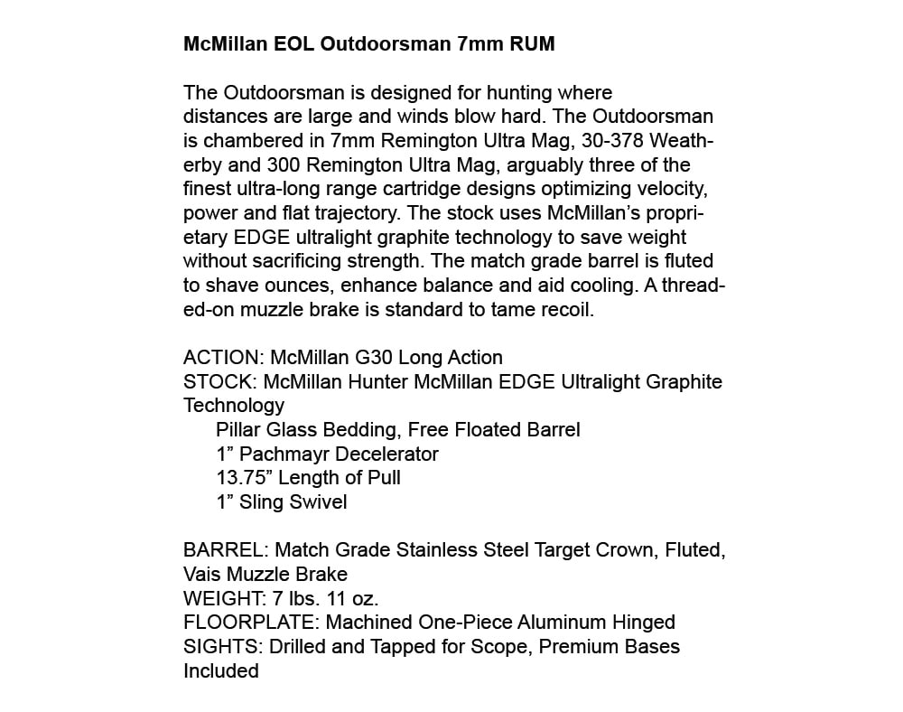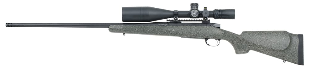 7mm EOL Mag (7mm RUM) Nf 5.5-22x56, Rings and Bubble, 26" 1-9 twist, Jewel Trigger, McMillan Edge Tech stock (olive w/ blk & tan), Small scuff on top of scope and on end of muzzle break. 120 rounds total through it.