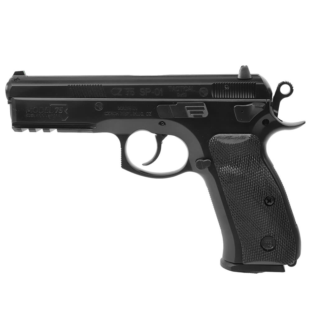 The CZ 75 SP-01 Tactical 50th Anniversary Elite is a full-size 9mm pistol that pays tribute to CZ’s five decades of firearm excellence with a blend of tactical functionality and commemorative styling. Built on the trusted SP-01 Tactical platform, it features a rugged steel frame finished in black polycoat for enhanced durability, paired with black rubber grips for superior handling. The ambidextrous decocker system ensures safe and intuitive operation, while the cold hammer-forged barrel and fixed 3-dot sights deliver consistent accuracy. Designed for compliance in capacity-restricted areas, the 10-round magazine maintains reliability without compromise. A special 50th Anniversary engraving on the slide adds a touch of distinction, making this model a standout for collectors and serious shooters alike.