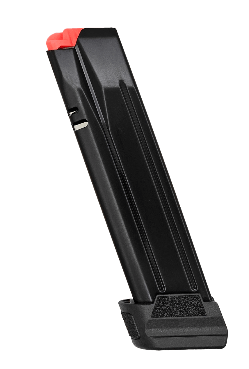 The CZ P-09 F Nocturne 9 mm 21-Round Extended Pistol Magazine is a high-capacity replacement magazine designed for use with CZ P-09 F series 9 mm pistols. It holds 21 rounds of 9×19 mm ammunition, providing increased capacity over standard magazines, and features a rugged construction for reliable feeding and smooth operation. The extended design also offers improved grip purchase for many shooters, enhancing control and handling during rapid reloads and sustained fire. Finished to complement Nocturne-style pistols, this magazine is a dependable choice for range training, competition, or defensive carry.