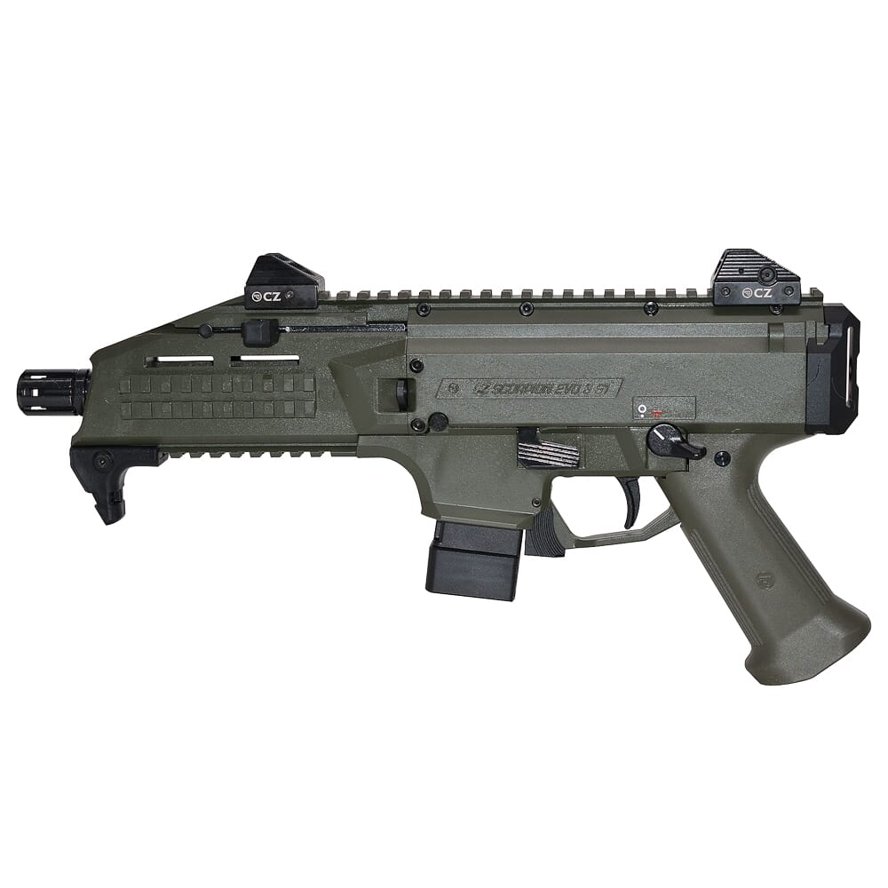 Simple, reliable, and highly customizable, the CZ Scorpion EVO 3 S1 pistol is an excellent choice for personal and home defense. It features a flattop picatinny rail in the 12 o’clock position for mounting an optic of choice, with additional picatinny rails in the 3, 6, and 9 o’clock positions for attaching tactical lights, lasers, and other accessories. The Scorpion also features a threaded muzzle compatible with accessories that utilize 1/2x28 and 18x1 right hand threads. In addition to its customization, the CZ Scorpion offers a wide array of user friendly features. The safety and magazine release are both ambidextrous, and the non-reciprocating charging handle can be easily swapped to the other side. The polymer grips can feature checkering on the front and back straps for superior control over the weapon, and the reach to the trigger can be adjusted as well.