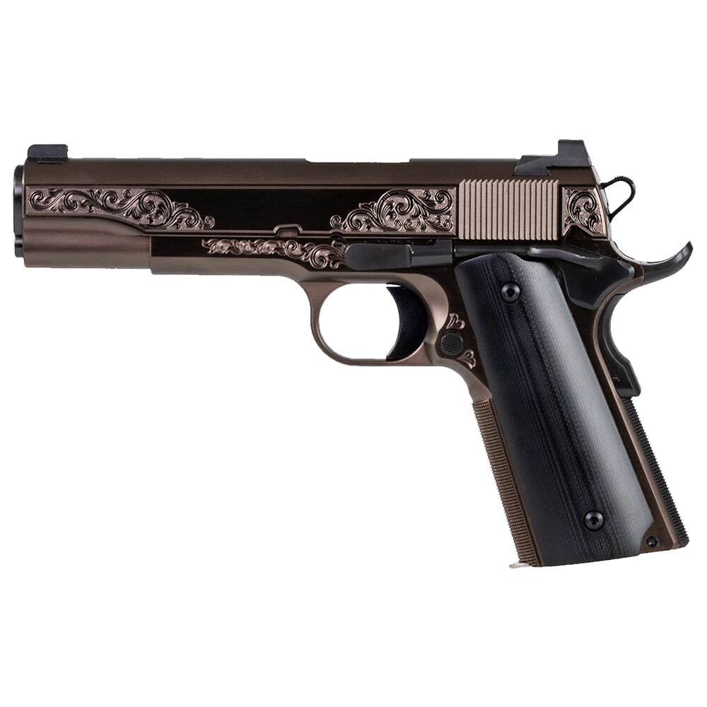 The limited edition Heirloom 1911 lives up to its name with the flawless quality and craftmanship that all Dan Wesson firearms are known for. The Heirloom’s slide and frame are perfectly fitted to each other, and both have been engraved with ornate scrollwork for a distinct and timelessly classic appearance. The aesthetics of the Heirloom are elevated even further thanks to a Bronze PVD finish. Rugged and sophisticated, the Bronze PVD finish gives the pistol a shiny luster as well as protecting the metal from corrosion and the elements. Black accents on all of the Heirloom’s small parts and mainspring housing perfectly contrast against the glossy Bronze PVD finish, further characterizing the handgun. The Heirloom is topped off with a set of sleek black G10 grips, which enhance the pistol’s looks and delivers a secure gripping surface in all conditions.