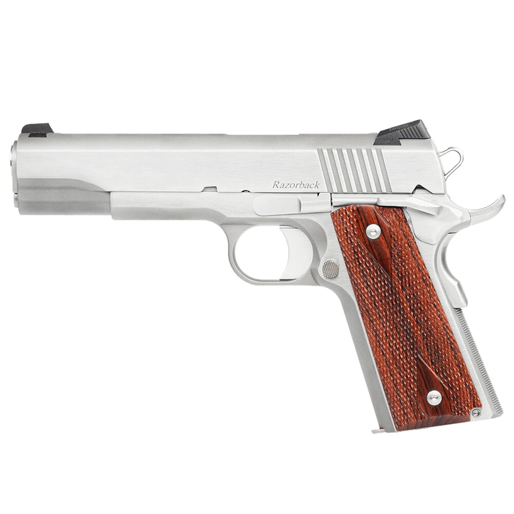 Made to the highest specifications and chambered in the potent 10mm Auto, the Razorback is highly versatile 1911 well suited for defensive applications, target shooting, and even hunting mid-sized game like deer or wild boar. This high performance handgun is outfitted with ramped, match-grade barrel which is optimized for smoothly feeding the most popular 10mm loads. The forged, stainless steel frame features an undercut trigger guard designed to place the shooter’s hand in an ideal position for comfort and accuracy, and 25 LPI on the back strap ensure a firm grip on the weapon without being abrasive. The Razorback is also equipped with fixed, Novak-style sights with rear sight serrations and an inverted rib machined directly into the top on the slide to greatly reduce glare and provide a clean sight picture regardless of the lighting conditions. In addition to its wide array of performance enhancing features, the Razorback offers a retro-style and aesthetically pleasing profile. A traditional frame cut and square grip profile retains the lines of a classic 1911 for an elegantly simple appearance. The flat sections of the frame and slide feature soft brushing, and the rounded sections are sand blasted to provide a nice contrast. The Razorback is completed with a set of double diamond grips made from premium cocobolo wood.
