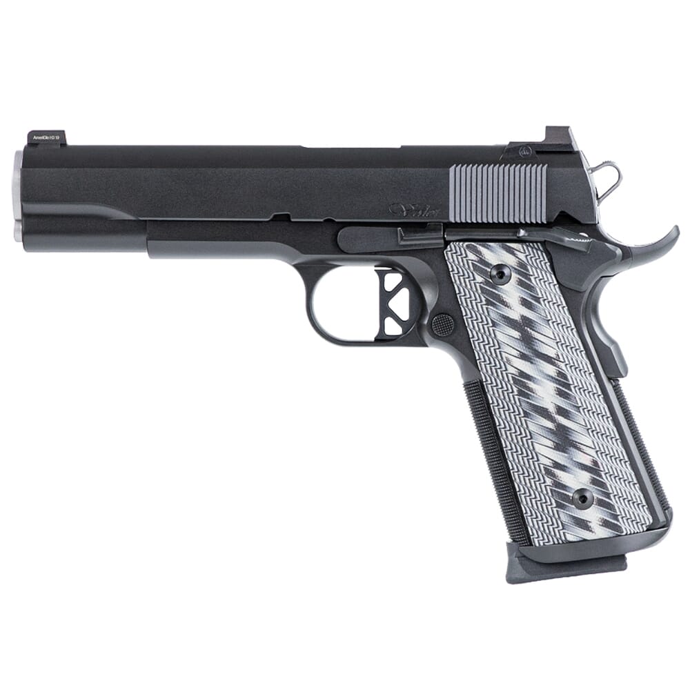 The Valor is a professional-level handgun that delivers the performance, accuracy, and aesthetics that Dan Wesson 1911s are known for. In terms of appearances, the Valor features a traditional cut that retains the lines of a vintage 1911, as well as a rear cocking serrations reminiscent of those found on early GI-style 1911s. The Valor also comes equipped with G10 grips, which not only look good, but also offer generous texturing for superior control over the weapon. The Valor’s elegant appearance is directly mirrored by its steadfast function and an array of user friendly features. The thumb safety is ambidextrous for comfortable shooting in either hand, and an updated slide stop is included to accommodate the installation of laser grips. The Valor’s sights are composed of a serrated U-notch rear sight, and a front sight with a tritium lamp for accuracy in low-light situations. An inverted top rib running between the front and rear sight has also been milled directly into the slide, this was included to help eliminate glare. In addition, the Valor is equipped with a Stan Chen SI magazine well to help funnel new magazines into the weapon and speed up reloads.