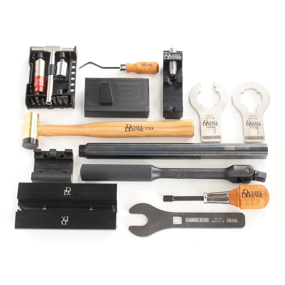 The Daniel Defense DDM4 & DD5 Armorers Kit is a comprehensive toolkit designed for maintaining and servicing DDM4 and DD5 rifles. This all-inclusive kit includes a variety of specialized tools such as torque limiters, punches, wrenches, and alignment blocks, all packed in a durable soft case for easy storage and transport. Each tool is crafted from high-quality materials to ensure long-lasting performance. Ideal for gunsmiths, armorers, and DIY enthusiasts, this kit provides everything needed to keep your Daniel Defense rifles in optimal condition, making it a must-have for any serious firearm maintenance.