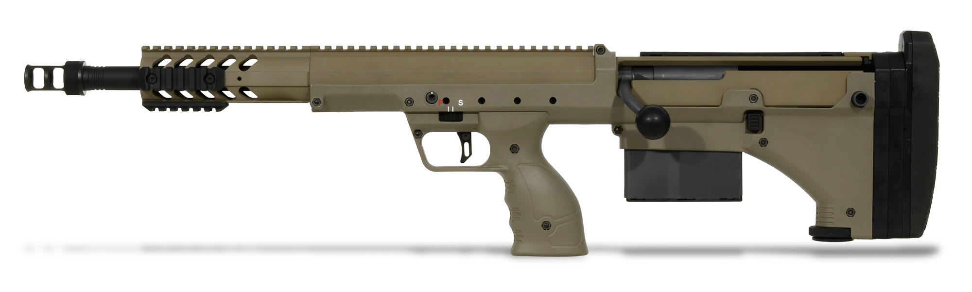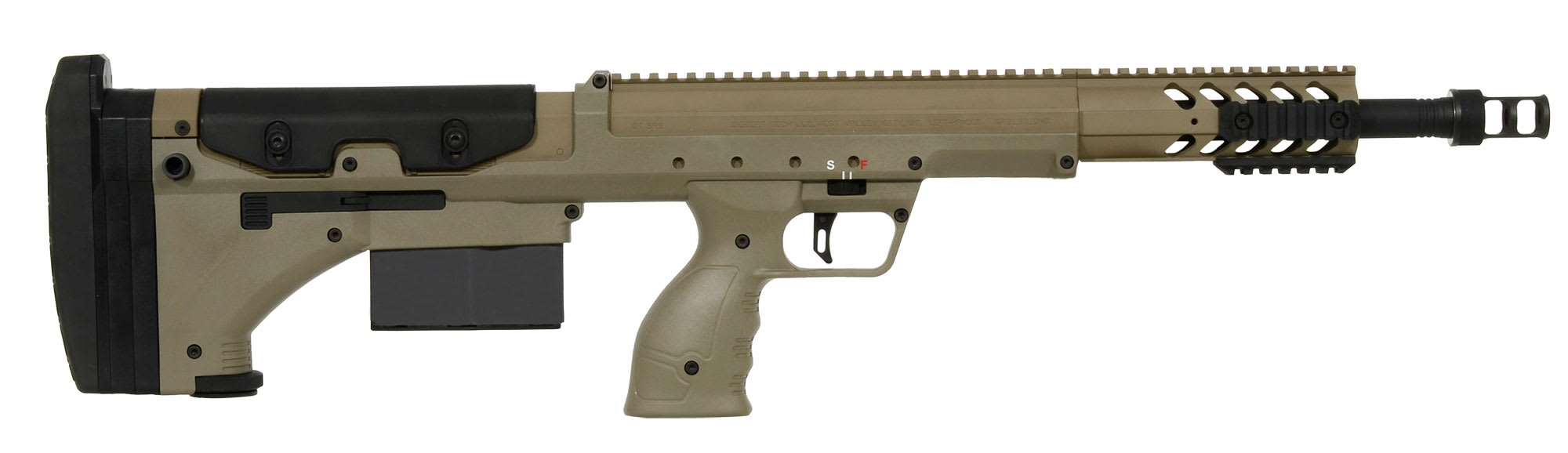 This left-hand Desert Tech SRS A1 Covert .338 Lapua features a FDE stock, FDE forend, 18" barrel, match trigger, ambidextrous safety, and picatinny rails. Includes monopod and brake.