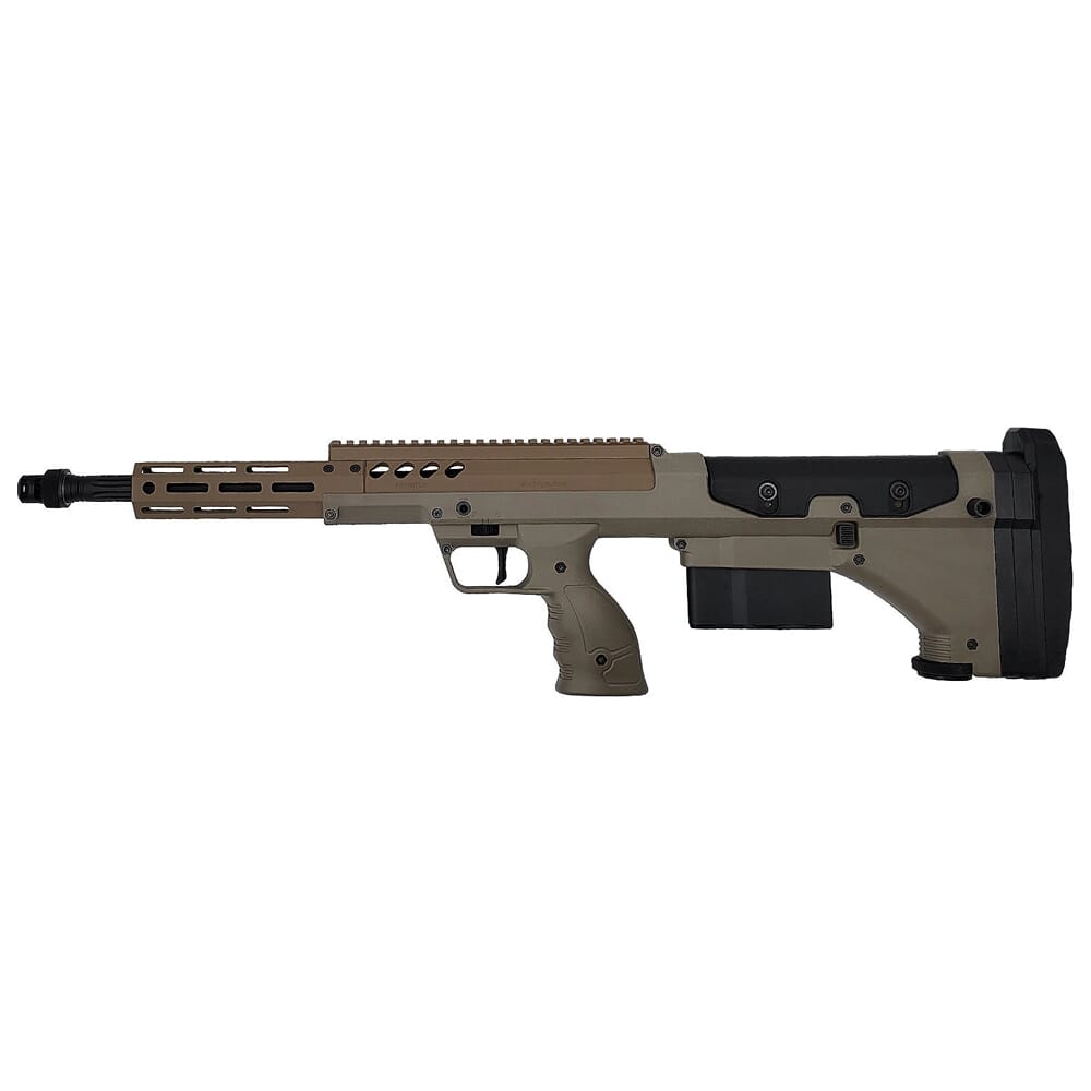 Desert Tech delivers a multi-caliber platform in a lightweight package with the SRS A2 Bolt Action Rifle. Its modular design allows calibers to be quickly swapped by simply replacing the bolt, barrel, and magazine. Caliber options include .308, 6.5 Creedmoor, 300 Win Mag, and 338 Lapua, and the conversion process doesn't require special tools. The SRS A2 utilizes a bullpup design, giving the rifle a short overall length without sacrificing the terminal performance of a full-length barrel. Overall length is reduced even further thanks to an innovative telescoping bolt design where the main body of the bolt is housed in an outer sleeve, which also results in shorter bolt stroke. The bolt also features 6 locking lugs arranged 2 layers with 3 locking lugs in the front and 3 locking lugs in the rear. The use of more locking lugs results more contact surfaces and greater lock-up consistency, which translates into more accuracy. Another accuracy-enhancing feature is its barrel-clamping mechanism. Instead of a single barrel clamp, it uses 4 smaller clamps, this reduces stress placed on the barrel when installed and provides more consistent clamping, thus improving accuracy by 30% compared to pervious models.
