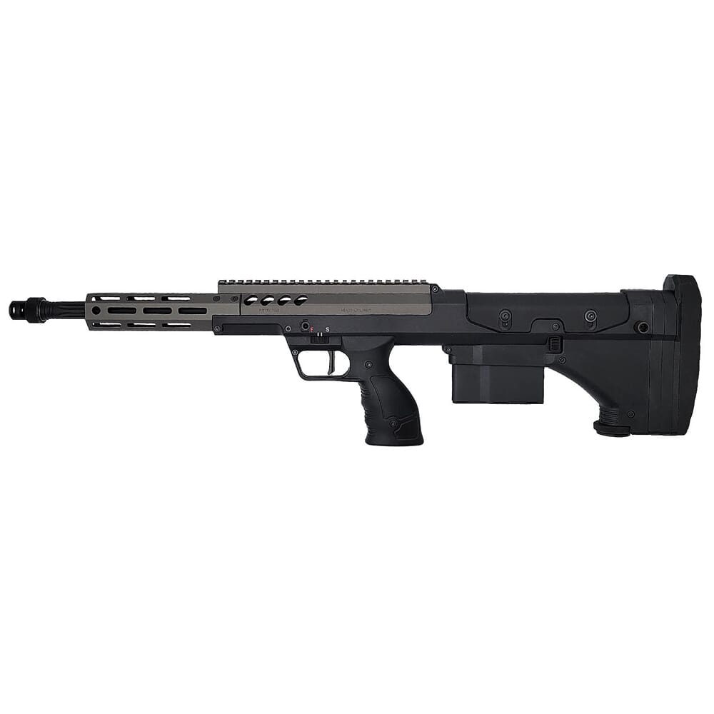 Desert Tech delivers a multi-caliber platform in a lightweight package with the SRS A2 Bolt Action Rifle. Its modular design allows calibers to be quickly swapped by simply replacing the bolt, barrel, and magazine. Caliber options include .308, 6.5 Creedmoor, 300 Win Mag, and 338 Lapua, and the conversion process doesn't require special tools. The SRS A2 utilizes a bullpup design, giving the rifle a short overall length without sacrificing the terminal performance of a full-length barrel. Overall length is reduced even further thanks to an innovative telescoping bolt design where the main body of the bolt is housed in an outer sleeve, which also results in shorter bolt stroke. The bolt also features 6 locking lugs arranged 2 layers with 3 locking lugs in the front and 3 locking lugs in the rear. The use of more locking lugs results more contact surfaces and greater lock-up consistency, which translates into more accuracy. Another accuracy-enhancing feature is its barrel-clamping mechanism. Instead of a single barrel clamp, it uses 4 smaller clamps, this reduces stress placed on the barrel when installed and provides more consistent clamping, thus improving accuracy by 30% compared to pervious models.