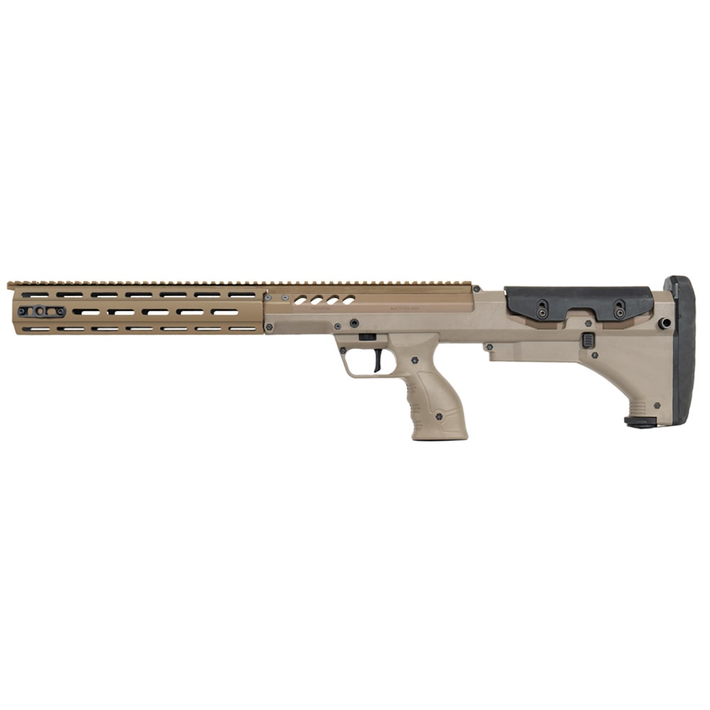 The Desert Tech SRSA2 Covert SD FDE/FDE Chassis System is the core bullpup chassis for building a compact precision rifle based on the SRS-A2 platform, finished in a flat dark earth/flat dark earth color scheme. Designed around a bolt-action layout with a highly modular architecture, it features a field match flat trigger adjustable from about 1.5 lb to 7 lb, an M-LOK-equipped handguard with integral tripod attachment points, and provisions for a monopod and standard scope mounts. The chassis itself measures approximately 4.45 in in width and 7.83 in in height, and while weight varies by configuration, comparable covert chassis sections are around 8.0 lb to 8.3 lb before barrel and accessories. When completed with a barrel, overall length typically ranges from about 27 in to 29 in depending on barrel choice. Sold as a chassis system only, it does not include barrel, bolt, magazine, or optics, but it supports Desert Tech’s quick-change barrels and caliber conversion kits for multi-caliber flexibility and compact long-range performance.