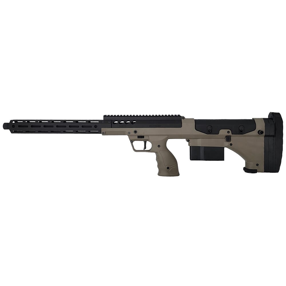 Desert Tech delivers a multi-caliber platform in a lightweight package with the SRS A2 Bolt Action Rifle. Its modular design allows calibers to be quickly swapped by simply replacing the bolt, barrel, and magazine. Caliber options include .308, 6.5 Creedmoor, 300 Win Mag, and 338 Lapua, and the conversion process doesn't require special tools. The SRS A2 utilizes a bullpup design, giving the rifle a short overall length without sacrificing the terminal performance of a full-length barrel. Overall length is reduced even further thanks to an innovative telescoping bolt design where the main body of the bolt is housed in an outer sleeve, which also results in shorter bolt stroke. The bolt also features 6 locking lugs arranged 2 layers with 3 locking lugs in the front and 3 locking lugs in the rear. The use of more locking lugs results more contact surfaces and greater lock-up consistency, which translates into more accuracy. Another accuracy-enhancing feature is its barrel-clamping mechanism. Instead of a single barrel clamp, it uses 4 smaller clamps, this reduces stress placed on the barrel when installed and provides more consistent clamping, thus improving accuracy by 30% compared to pervious models.