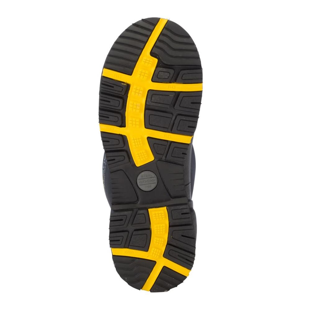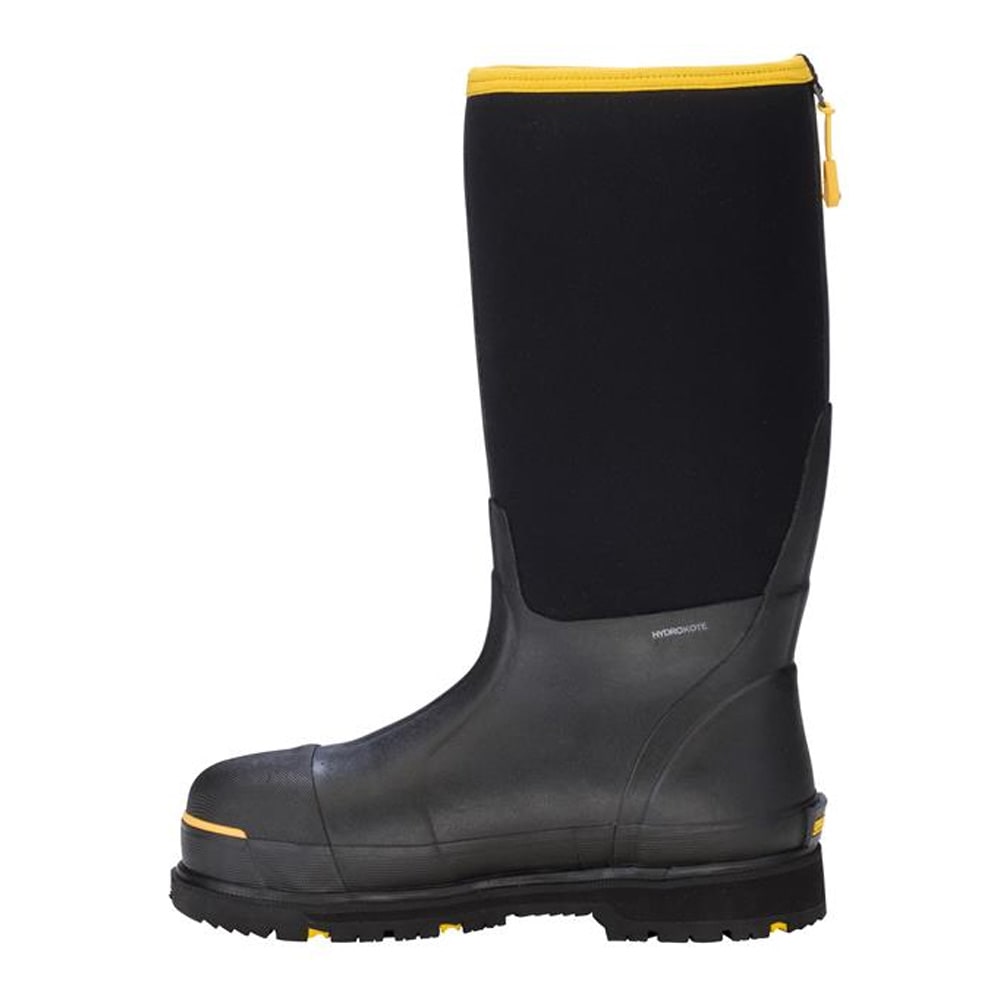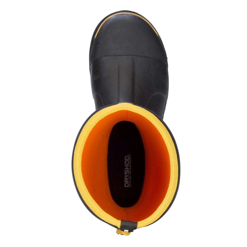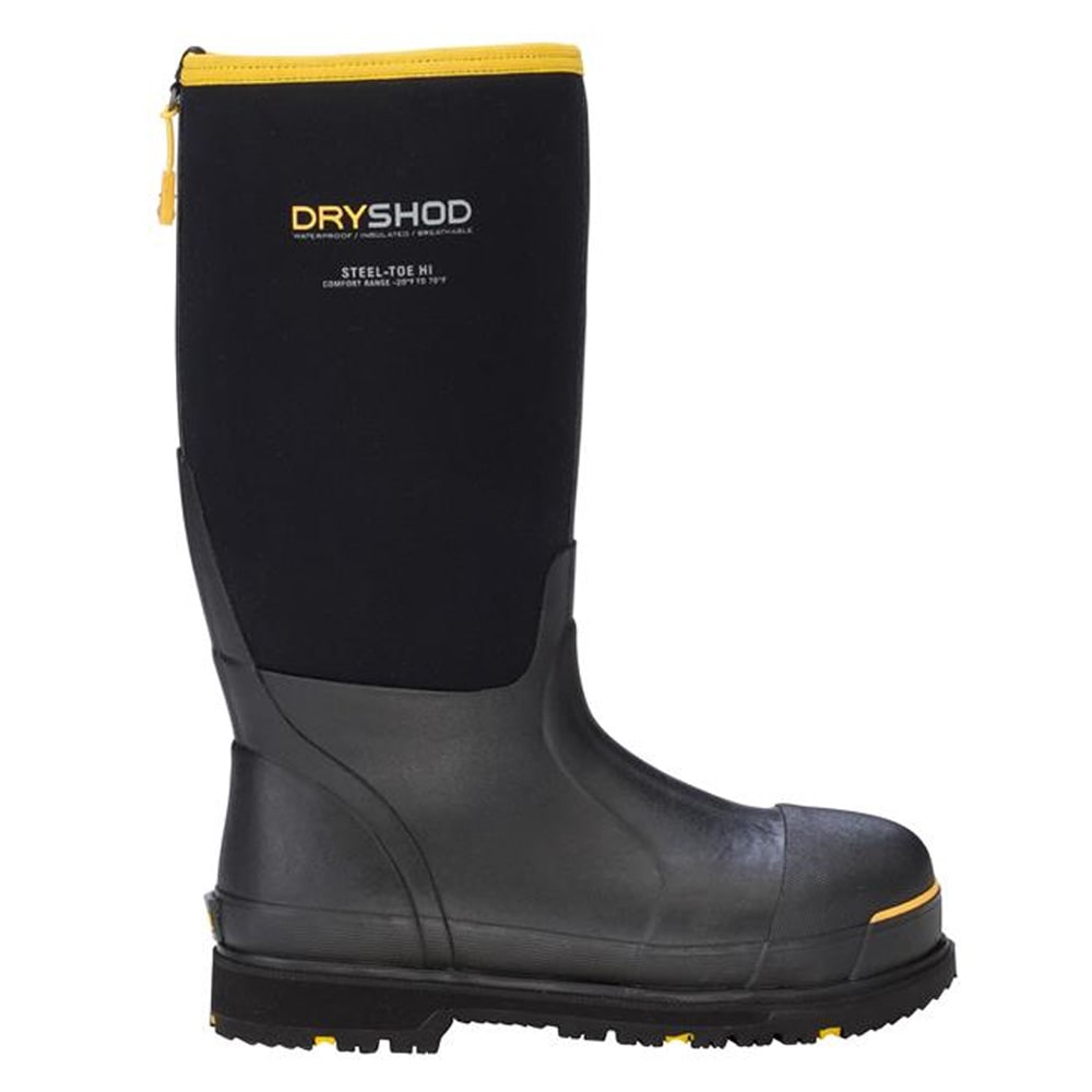 These Dryshod Steel‑Toe Hi Boots (Black/Yellow) in size 14 are rugged, high-cut work boots built to keep your feet safe, dry, and comfortable in tough conditions. Their 100% waterproof rubber upper shields against water and mud, while a 5mm Densoprene® foam bootie provides insulation from the cold. The ANSI-rated steel toe offers strong protection from impacts, and triple-layer reinforcements at the toe and heel improve longevity. A steel shank supports the arch, and the EVA sockliner is removable for custom comfort. The boots also feature breathable mesh lining, back-pull tabs for easy wear, and a roll-down calf pipe for adjustable ventilation.
