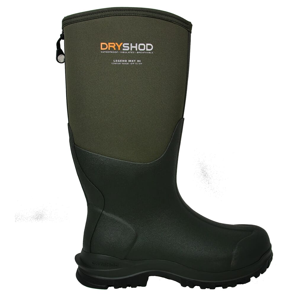 DryShod’s MXT Legend Boots deliver comfort and protection all year round. Equally well suited for use on the farm for in the woods, the MXT Legend Boots come equipped with the MXT Cupped Outsole. This outsole is designed with high sidewalls for improved support and protection around the sides, heel, and toe areas. The aggressive tread pattern found on the natural rubber delivers exceptional traction on all terrain conditions. Robust tread lugs and high void areas also provide superior wet surface grip in mud, on wet rocks, or when climbing ladder stands and tree steps – an important safety feature. The MXT Legend’s shell is composed of multiple layers of hand-laid rubber, and features a Hydrokote water-repellent treatment that causes water to roll off and dry almost instantly, making the MXT Legend Boots 100% waterproof. The 5mm of Densoprene foam insulation keeps the cold out, and genuine natural rubber hand-laid overlays ensure years of durability. Other features include a roll-down calf-pipe for venting in warmer temperatures or tucking you pant legs into, and convenient pullup tabs allows for easy on and off.