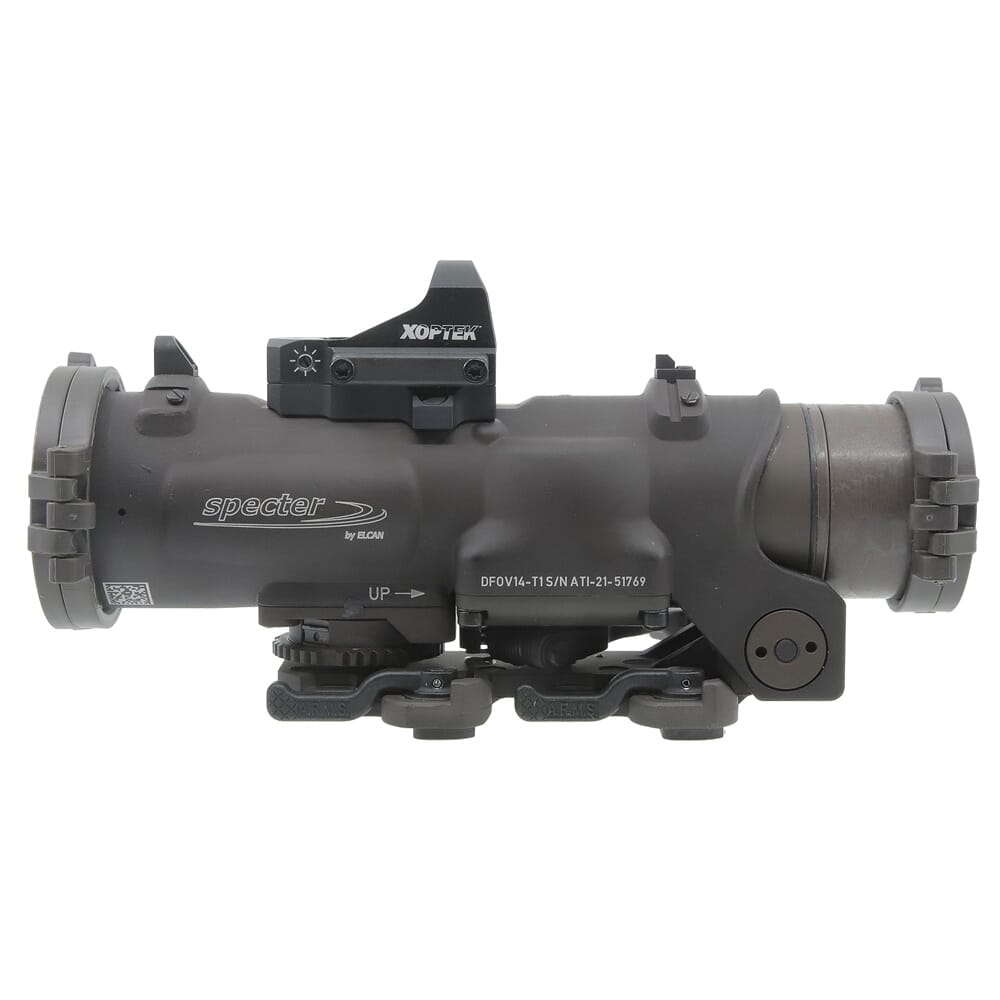 In addition to its impressive optical abilities, the SpecterDR 4x/1x ships with the exclusive A.R.M.S. MK-II Mount. Compatible with MIL-STD 1913 Picatinny Rails, the A.R.M.S. MK-II Mount features an integrated precision adjustment wheel, allowing the user to use the tip of their finger (no tool required) to change the tension on the mount for a perfect fit on the rail. The adjustment wheel on the A.R.M.S. MK-II mount comes pre-gauged and locked to the center of MIL-STD rails, and features .002 hash marks for fine-tuning tension. Furthermore, the SpecterDR 4x/1x includes an XOPTEK Micro Reflex sight for a close-range aiming solution or as a backup sight.