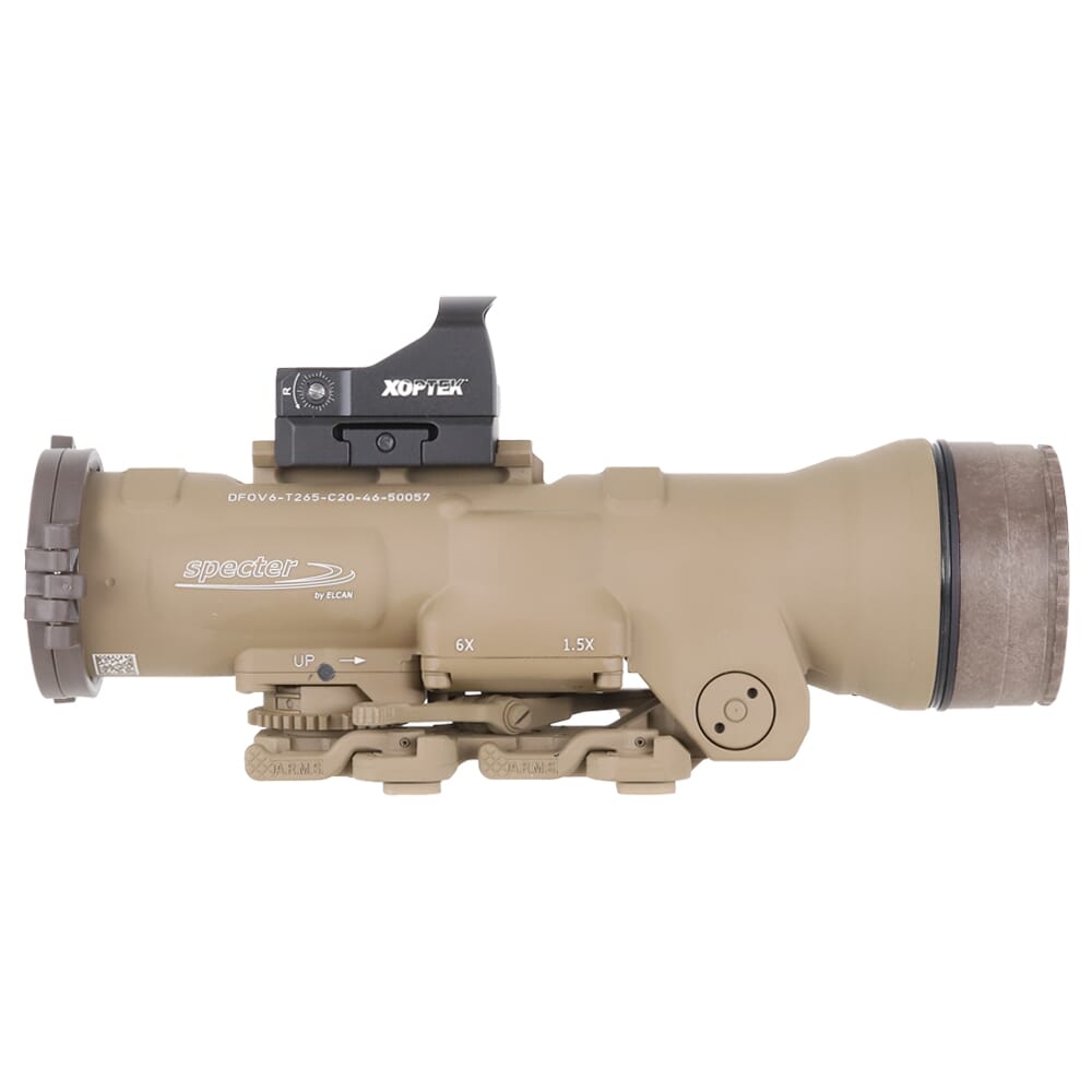 Elcan’s SpecterDR 1.5x/6x represents a major leap forward in magnified rifle optics. Unlike the majority of magnified optics that rely on twisting a magnification ring, the SpecterDR 1.5x/6x utilizes an innovative throw-lever to change magnifications. This allows the user to instantly switch between the 1.5x and 6x magnifications, making the SpecterDR perfect for both close and mid-range engagements. The SpecterDR’s close/mid-range capabilities are further enhanced by the optic’s illumination function, which can be used to illuminate the entire crosshair for longer-range targets, or illuminate a bright center dot for accurate close range shooting. Other features of the SpecterDR includes a generous field of view which remains the same at both 1.5x and 6x magnification, as well as a wide field of view for greater situational awareness. In addition, the SpecterDR 1.5x/6x includes an XOPTEK Micro Reflex sight for a close-range aiming solution or as a backup sight.