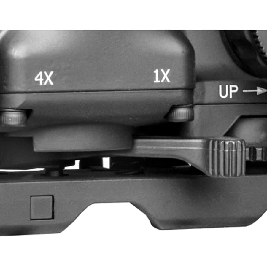 The Elcan SpecterDR DFOV4-B146-C10-SAI3 is a professional dual-role combat optic that instantly switches between 1x CQB and 4x medium-range magnification via an ambidextrous throw lever, maintaining identical 70mm eye relief in both modes. The 2024 model features a Cerakote black finish, integrated Picatinny rails, and a 32mm objective lens with an 8mm exit pupil for strong low-light performance. The CX5395 BDC reticle is calibrated for 5.56x45mm NATO M855 from a 16-inch M4 barrel, with five LED brightness settings including two night-vision compatible modes. Turrets adjust in 0.5 MOA increments over a ±60 MOA range and the optic mounts to any MIL-STD-1913 rail via the included A.R.M.S. MK-II throw lever mount. Rated waterproof to 66 feet and shockproof to 450 G's, the SpecterDR weighs 640g in a compact 153mm package.