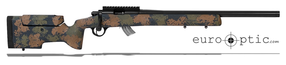 This .22 LR Rimfire Trainer rifle features a Stiller Precision 2500XR repeater action, Manners T4A Black Forest Stock with black metal, a 1.25" diameter shank "heavy Palma" contour Bartlein Barrel, Rifle Basix trigger, Remington-type side safety, and a Seekins Precision Triggerguard.