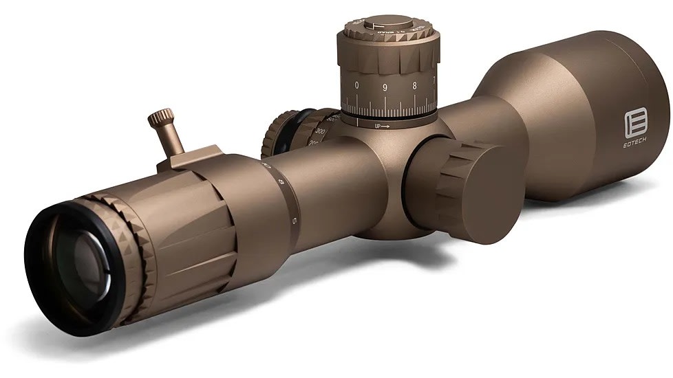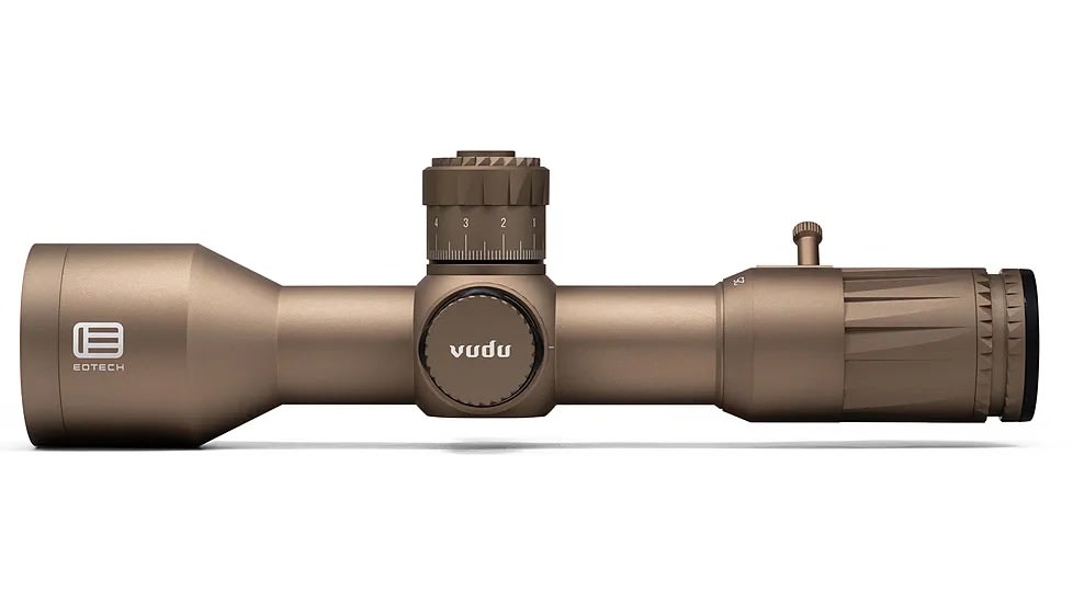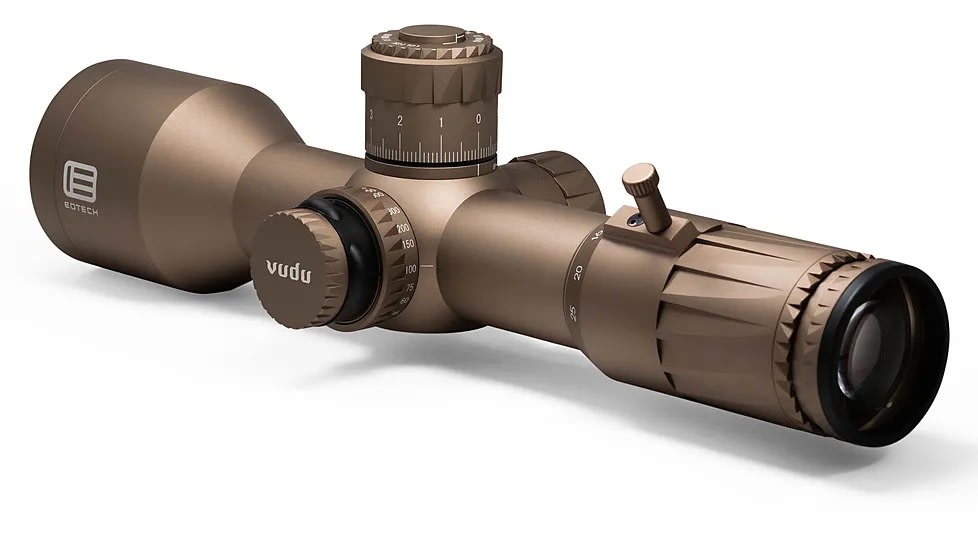 The EOTech Vudu 5-25x50 FFP with MD4 (MOA) reticle is a high-performance, precision rifle optic engineered for medium to long-range shooting on compact platforms. At just 11.2 inches long and weighing 29.5 oz, it is among the shortest first-focal-plane scopes available, making room for clip-on night-vision or thermal devices up front. Built on a 34 mm aircraft-grade aluminum tube with a hard-anodized finish, the scope is rugged, waterproof, fogproof, and shock-resistant. Its MD4 reticle, etched on the first focal plane and aligned with MOA hashmarks, enables intuitive ranging and hold-over regardless of magnification. Illumination is handled via a red LED with 10 brightness levels and a 2-hour auto shut-off to preserve battery life. Turrets offer 0.25 MOA per click precision, with a full 100 MOA of elevation and 80 MOA of windage travel. The elevation turret features a push/pull locking mechanism with EOTech’s EZ Chek Zero‑Stop for quick return-to-zero functionality. Internally, the optic provides a generous adjustment range thanks to its large tube diameter. The scope’s XC™ high-density, low-dispersion glass with multi-layer anti-reflective coatings delivers strong light transmission, excellent edge-to-edge clarity, and accurate color rendition in low-light environments. With a 5-25x magnification range, 50 mm objective, and a field of view of 23.3 ft at 5x narrowing to 4.7 ft at 25x (at 100 yds), it offers versatility for tactical and competitive shooting alike.