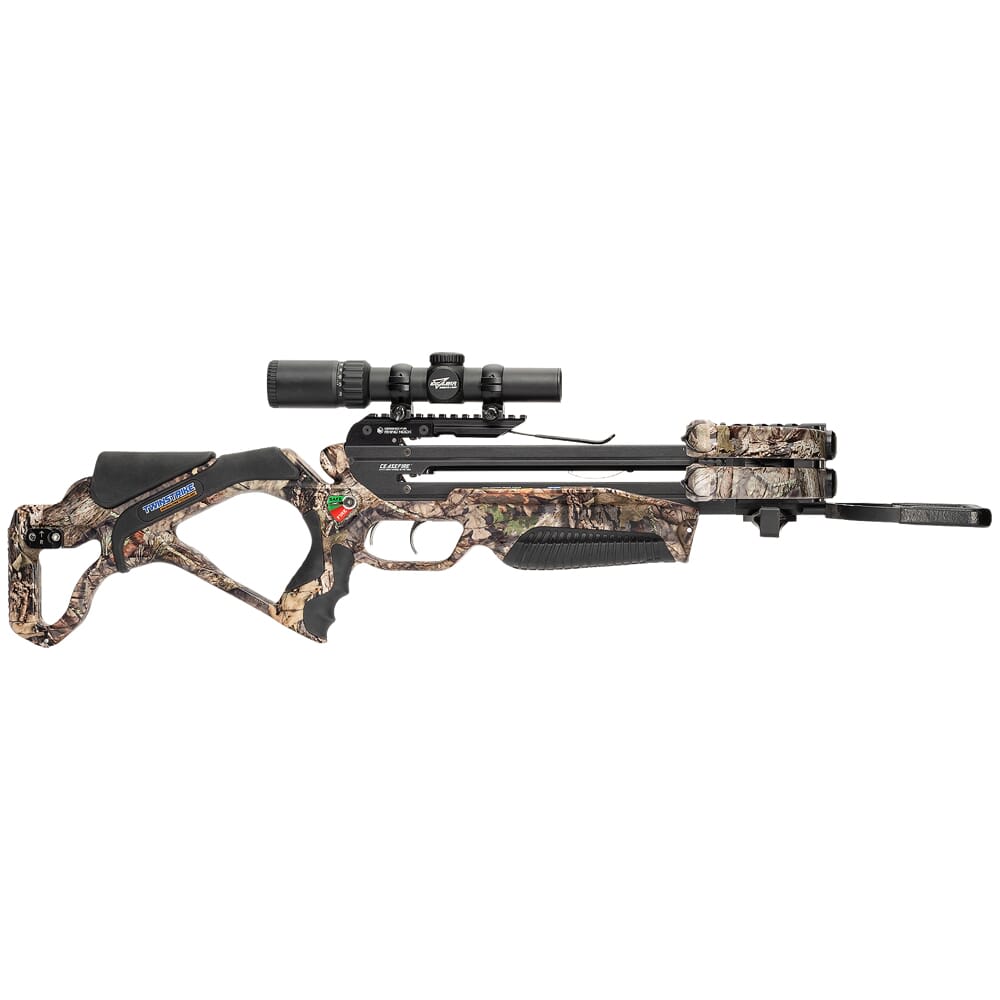 Sleek, lightweight, and perfectly balanced, the TwinStrike has everything you need in a crossbow – times two. This totally unique recurve crossbow is equipped with not one, but two rails, similar to the barrel configuration of an under/over shotgun. It features two, 4lb, match-grade, frictionless triggers; the front fires the top arrow and the rear trigger fires the bottom arrow. With two arrows at your disposal, the TwinStrike can be used to engage two targets by eliminating the need for a time-consuming reloading process. The TwinStrike can also be used to effectively “double tap” targets by firing both arrows in rapid succession, and can even fire both arrow simultaneously by pulling both triggers for twice the penetration. In addition to its double-shot capabilities, the TwinStrike has an ultra-short length of just 33.4 inches, making it an excellent choice for shooting in confined spaces such as a blind or tree stand. It also comes equipped with the proprietary CeaseFire Technology which provides an additional level of safety by preventing the crossbow from firing unless an arrow is loaded and the safety is disengaged. Other features of the TwinStrike include an easy to use and silent External Crank mechanism to safely and securely cock the crossbow or de-cock it without shooting an arrow.