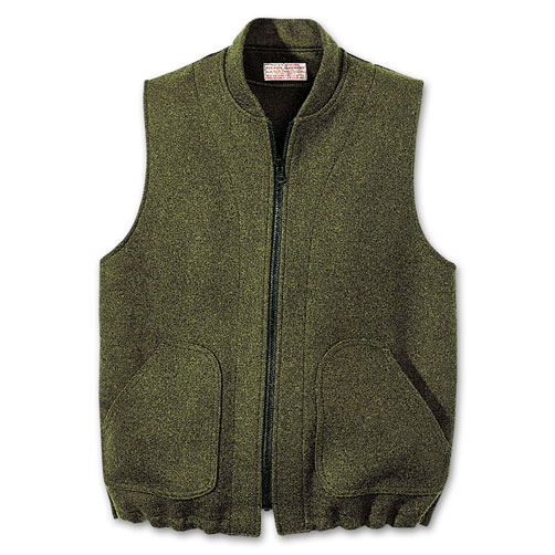 This large, forest green Filson Wool Vest Liner features heavyweight 24ox Mackinaw wool, a stand-up collar, hand warmer pockets, and an elastic cinch cord at waist.