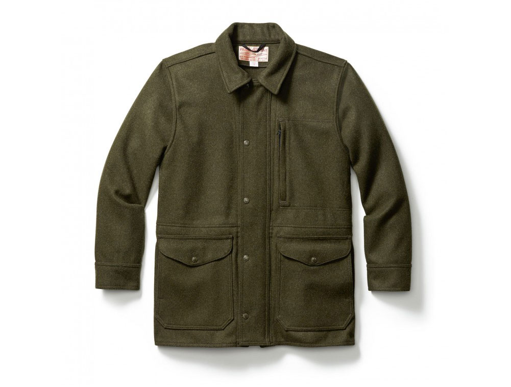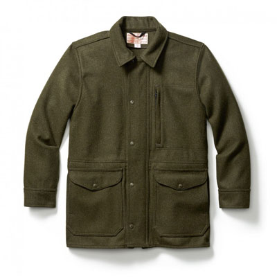This XL forest green Filson Xlong Wool Mile Market Jacket features 100% USA virgin wool, front zipper with snap-closure storm flap, and drawcord-adjustable waist.