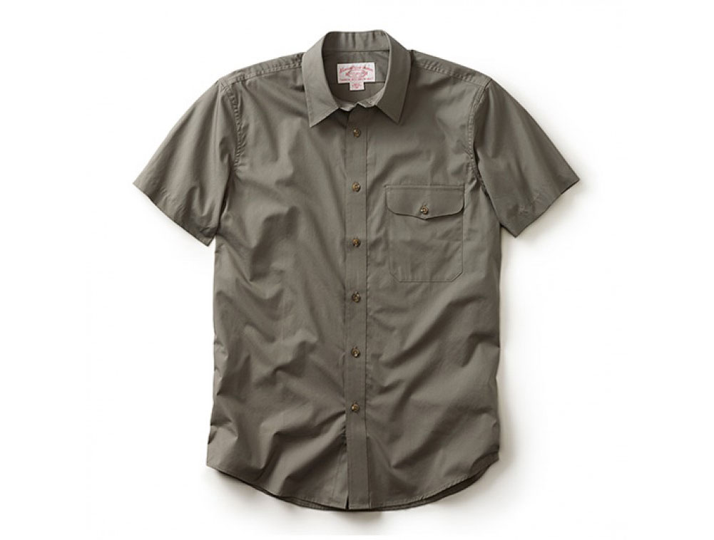 Perfect for travel, this XL olive Filson S/S Feather Cloth Shirt features a double-needle construction, lightweight feather cloth, and is cut for mobility.
