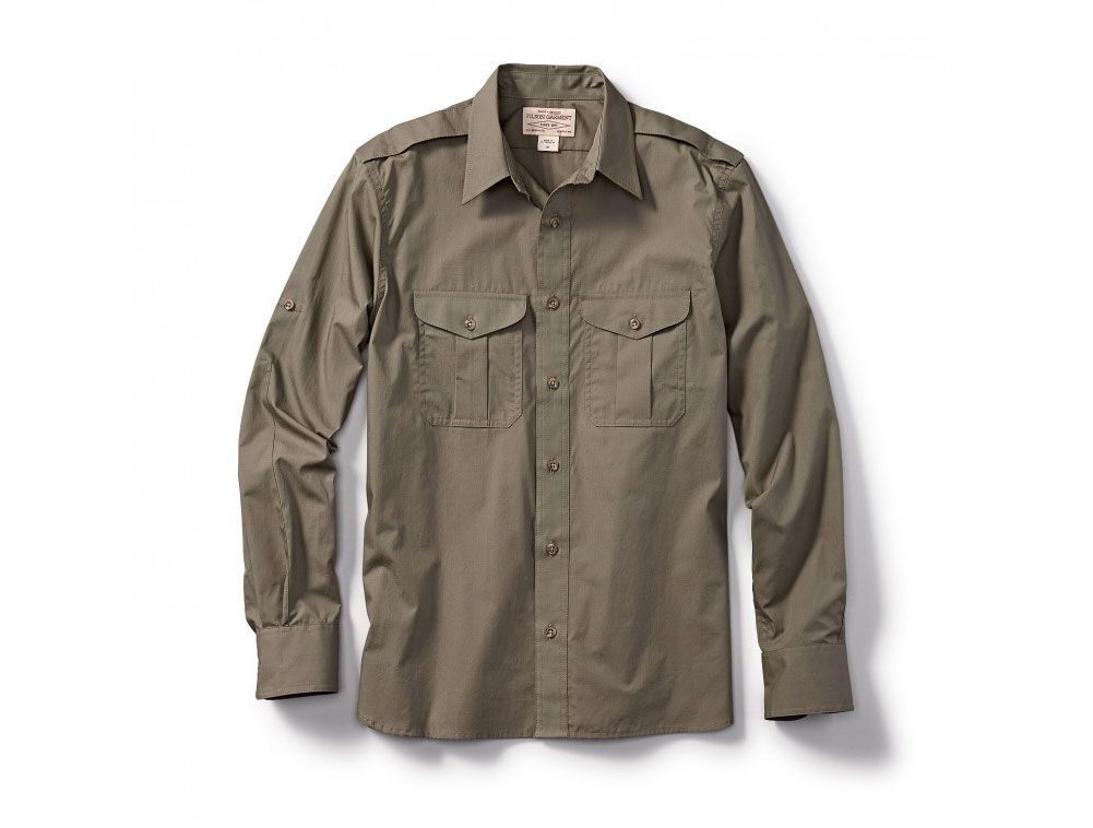 This small, olive Filson Expedition Shirt is a featherweight cotton shirt which features a Seattle fit, high back yoke with pleats, underarm eyelets, double-needle construction, and is cut for mobility.