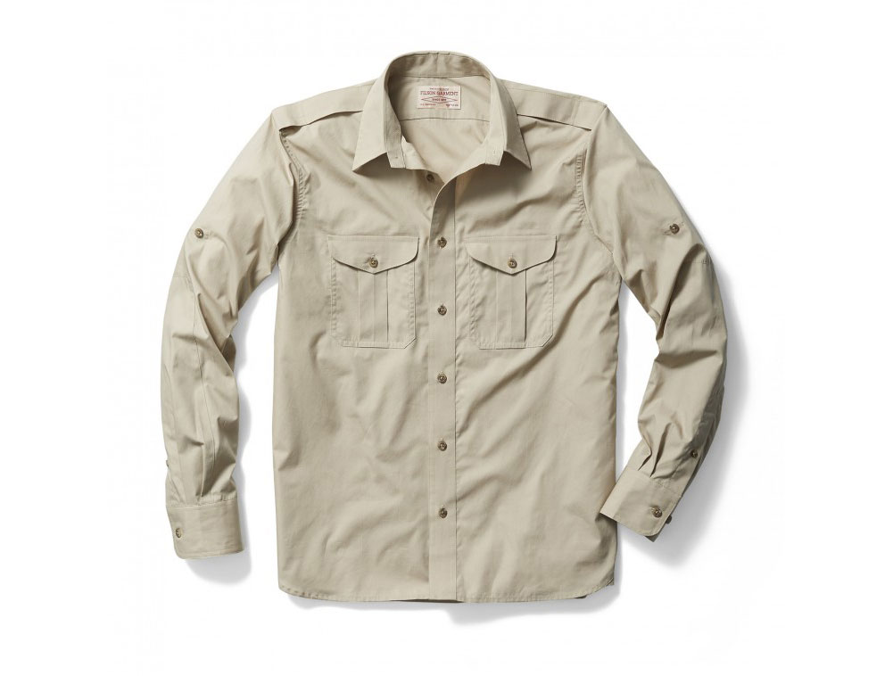 This small, desert tan Filson Expedition Shirt is a featherweight cotton shirt which features a Seattle fit, high back yoke with pleats, underarm eyelets, double-needle construction, and is cut for mobility.