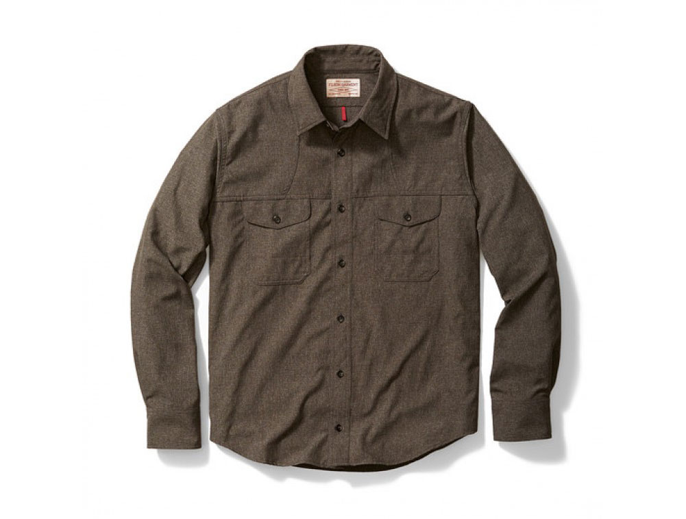 This 2XL mulch Filson Hunting Shirt features a Seattle fit, quick-dry fabric, UPF 50, underarm eyelets, reinforced shoulders, and pockets.