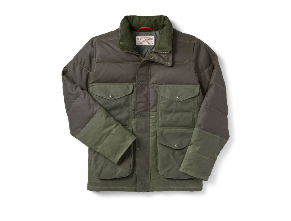 This medium, otter green Filson Down Cruiser is a lightweight winter jacket that features 100% European goose down insulation, nylon lining, and a wind resistant, water repellent shell.