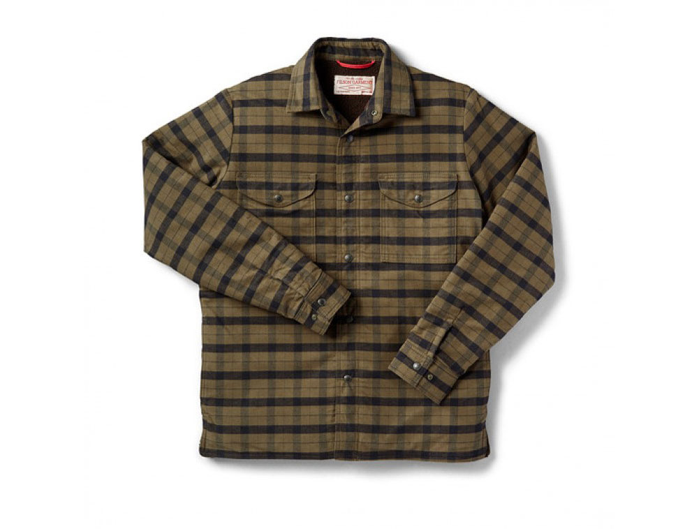 Perfect for layering in cold weather this 2XL otter green and black plaid Filson Insulated Alaskan Guide Jac Shirt is a cotton flannel fully lined with 100g of quilted insulation with slick-lined sleeves and large front buttons.