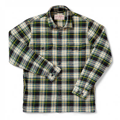 This black and ivory plaid Filson Jac-Shirt is a breathable cotton shirt built for layering with a roomy build and hand warmer pockets.