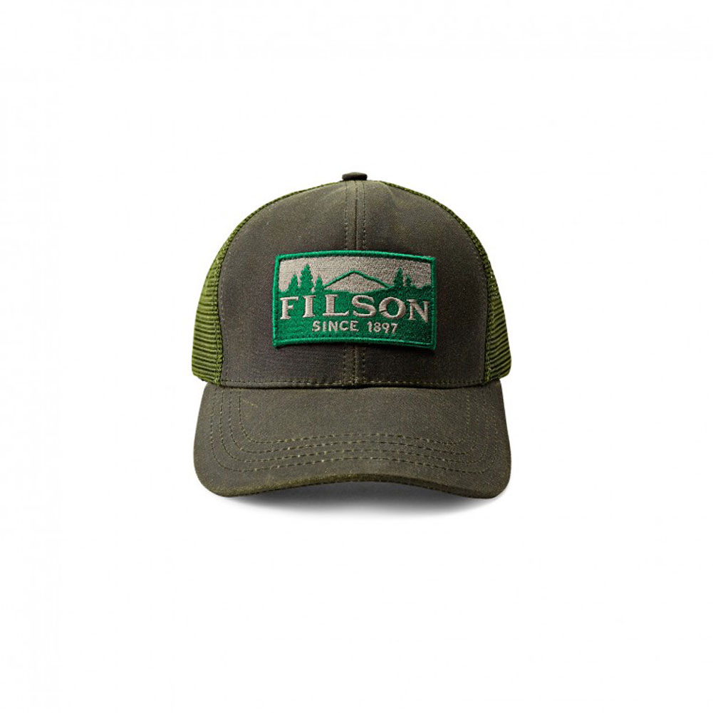 This otter green Filson Logger Mesh Cap is a six-panel cap that hugs your head comfortably. This cap features an adjustable strap with brass buckle on the back, pre-curved bill, Filson embroidered patch on front, mesh back, and rain-repellent tin cloth.