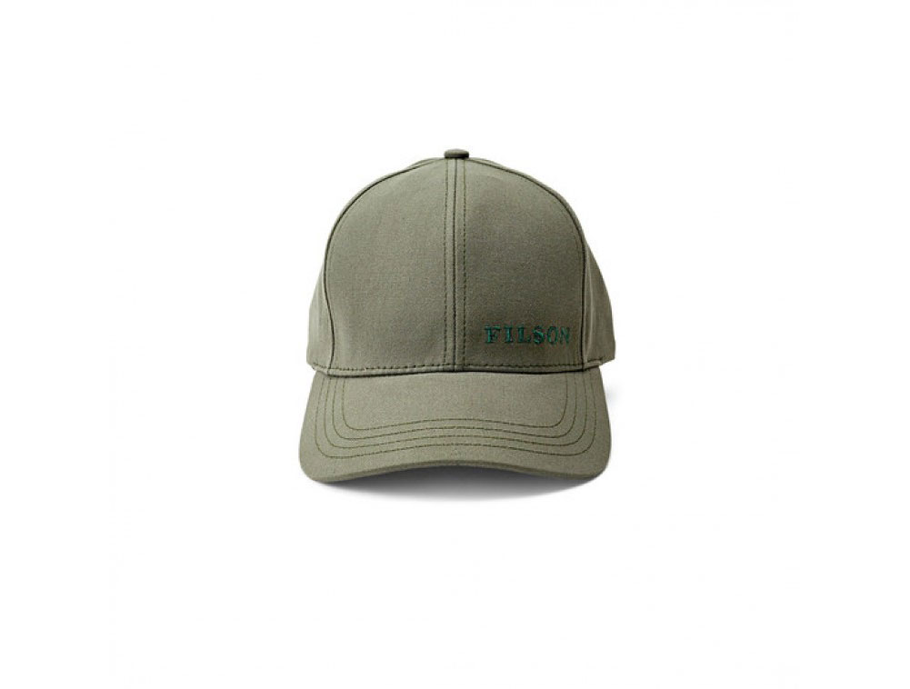 This olive Filson Logger Cap is a classic which features six-panel construction, pre-curved bill, breathable cotton twill fabric, brass buckle on adjustable strap in back, and embroidered Filson logo.