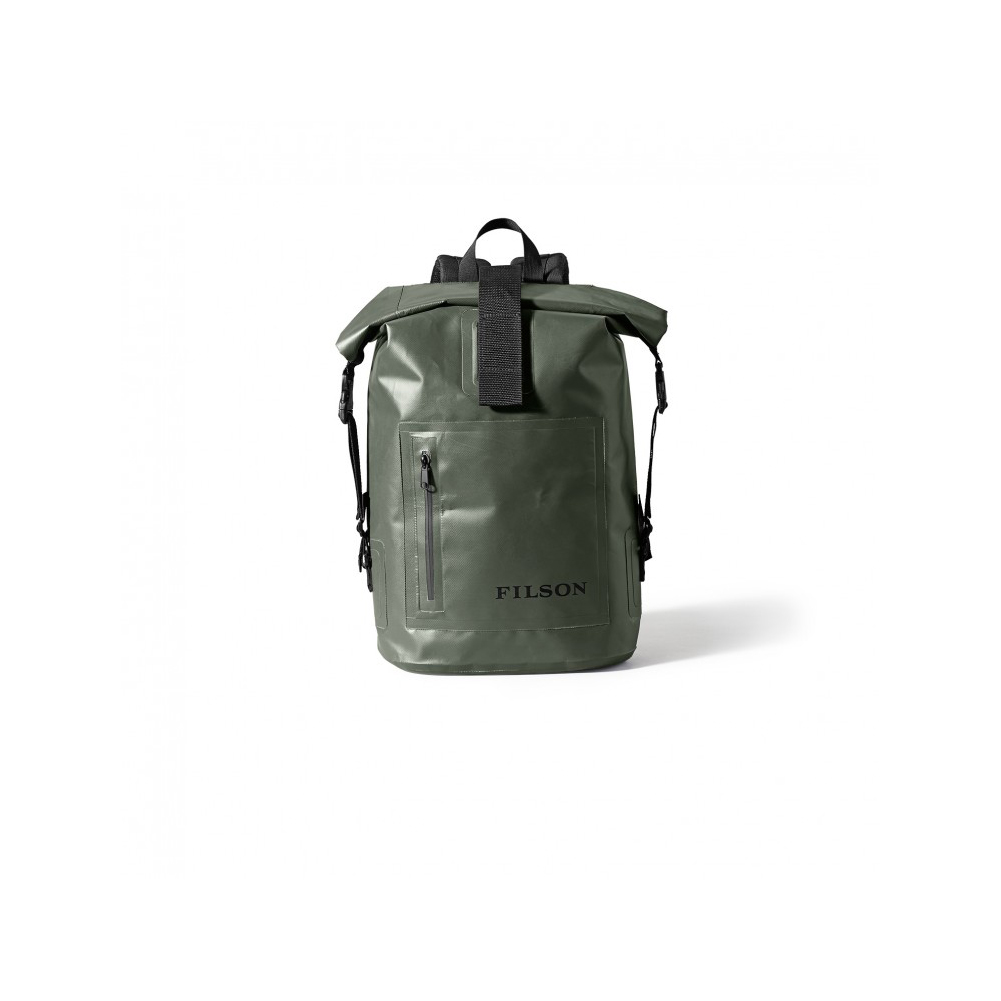 Travel no matter the weather with this green Filson Dry Day Backpack which features an oval base, roll-down top, padded shoulder straps, and a hook-and-loop closure.
