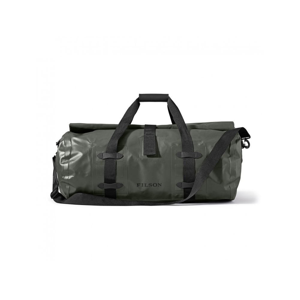 Protect your cargo with this green Filson Dry Duffle Large which features adjustable buckle straps that cinch down on the sides, roll top secured with a hook-and-loop tab, vinyl-coated polyester, and radio-frequency-welded seams.