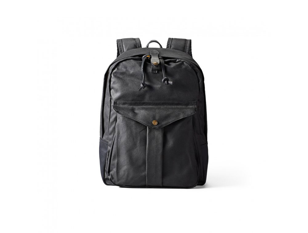This black Filson Journeyman Backpack is a rugged pack with a padded back complete with cotton webbing reinforcement, soft Moleskin cotton lined shoulder straps, interior padded laptop sleeve, and a gusseted opening. This pack is constructed from rugged twill, oil finish tin cloth, and poly/cotton lining.