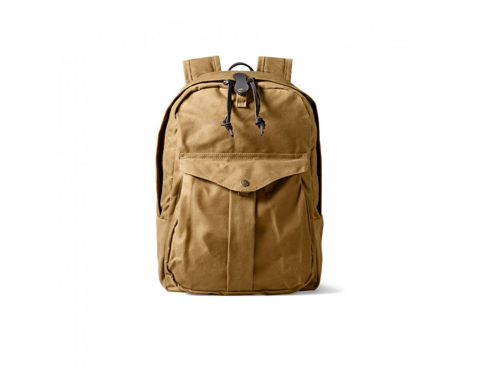 This tan Filson Journeyman Backpack is a rugged pack with a padded back complete with cotton webbing reinforcement, soft Moleskin cotton lined shoulder straps, interior padded laptop sleeve, and a gusseted opening. This pack is constructed from rugged twill, oil finish tin cloth, and poly/cotton lining.