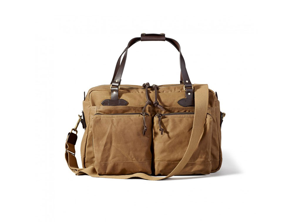 The perfect overnight bag. This tan Filson 48-Hour Duffle features bridle leather handles with two-snap grip, reinforced base, dry finish cover cloth lining, and oil finish tin cloth.