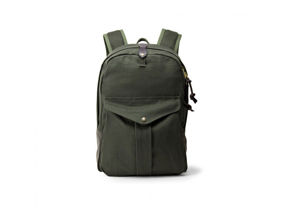 This otter green Filson Journeyman Backpack is a lightweight, lined backpack which features a padded laptop sleeve, slotted pockets, and padded shoulder straps with bridle leather. This pack is made from cotton canvas, matte nylon, and dry finish cover cloth lining.