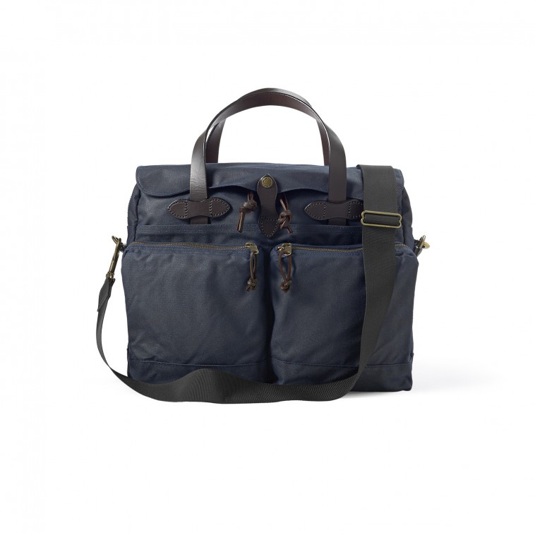 This water-repellent, fully-lined, navy Filson 24 Hour tin cloth Briefcase has multiple pockets, a trolley strap, removable shoulder strap, and interior laptop divider. Formerly known as 72 Hour Briefcase.